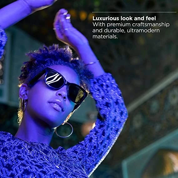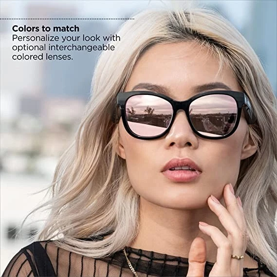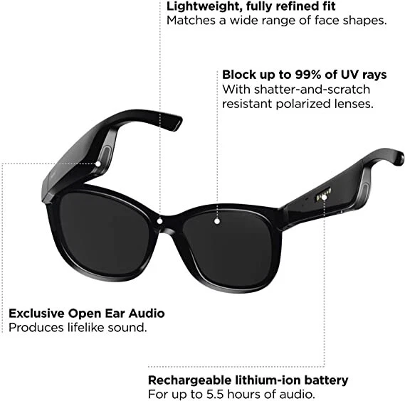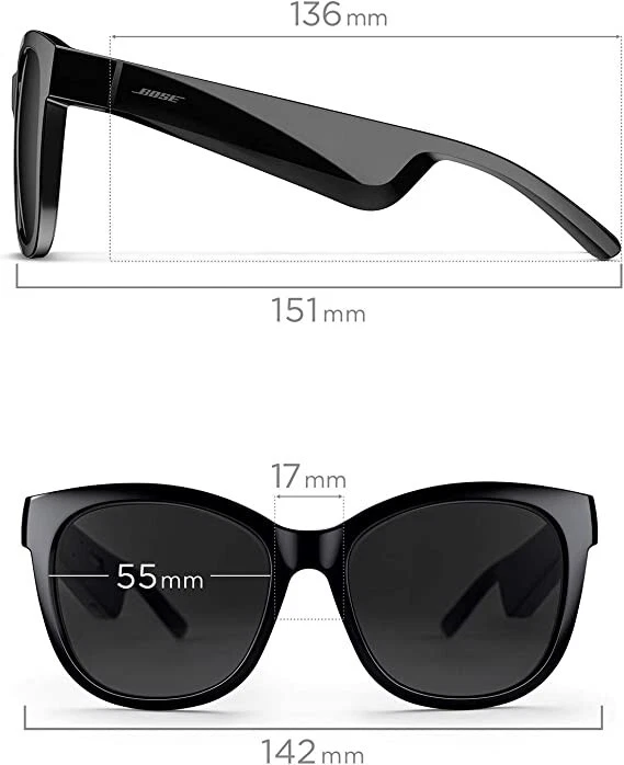 Bose Frames Soprano, Polarized Smart Glasses, Bluetooth Audio Sunglasses, with Open Ear Headphones, Cat-Eye, Black Condition: 95% New & Open BOX, Redesigned for luxury — Thoughtfully refined and strikingly elegant, the latest Bose sunglasses blend enhanced features and designs for an elevated way to listen. Cat eye Bluetooth sunglasses — Finished in High-Gloss Black, Bose Frames Soprano style combine retro glam, playful stylings, and ultramodern materials. Lens Width: 55 mm ; Bridge Width: 17 mm ; Temple Length: 136 mm ; Temple Width: 142 mm Bose Open Ear Audio sunglasses — Hear lifelike audio while others hear practically nothing. It’s an experience that leaves you free to engage with the world, all while discreetly listening to music Polarized lenses — These music sunglasses include shatter- and scratch-resistant polarized lenses to reduce glare, enhance visibility, and block 99% UVA/B rays. And you can add your prescription (Rx) anytime. Improved battery life — Rechargeable music sunglasses with up to 5.5 hours of continuous listening per charge. Bose sunglasses fully charge in 1 hour. Bluetooth sunglasses — Pair your audio sunglasses to your device to listen to your favorites and take crystal-clear calls. Reliable Bluetooth range up to 30 ft. Advanced mic system — Designed to focus on your voice and reduce the sound of wind and noise around you, take crystal-clear calls on your Bose cat eye sunglasses. Disclaimer: When you open Bose Music App, click Headphones to connect your Frames. Frames imagery will be visible on the App post the full product release On Dec 6, 2023 at 02:35:14 PST, seller added the following information:
