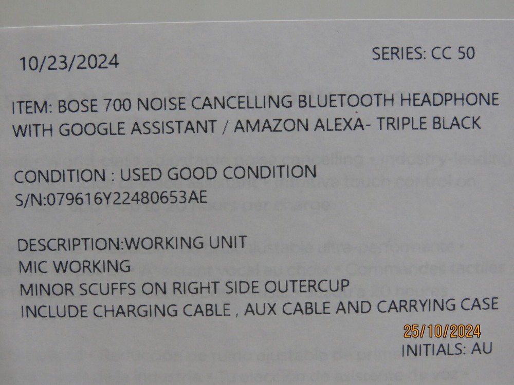 Bose Noise Cancelling 700 Bluetooth Wireless Over-Ear Headphones - Black Functional Condition: Tested and Functional. Cosmetic Condition: This is a Used Item and Normal Wear (Scuffs & Scratches) is Expected. Items included in this listing: Headphones Charging Cable Aux Cable Case Items NOT included in this listing: N/A Thank you for Shopping with Us! ENJOY Free Shipping in USA & Low Cost Shipping to CANADA! Terms of Sale NOTE: Our Listings only include items as pictured - Please do not assume any item is included if its not pictured. We will try our best to picture all items included in this listing as well as its cosmetic condition. We Guarantee & Stand Behind our product and commitment to provide you with o nly Original, Branded, OEM & Genuine Products Shipping A complete and correct shipping address is essential. We cannot guarantee the shipping address can be changed after checkout. Sales Tax will be charged to all Canadian & USA Buyers. Combined shipping is not guaranteed. We are unable to change any content of your order based on the eBay checkout note or PayPal message. Customers with shipping addresses outside of the U.S.A and Canada are responsible for all duties and import taxes. Please contact your customs for information Bidding All items are accurately described and pictured. Please ensure you are consciously bidding on the items as described. Payment Payments are expected at the time of purchase or in case of Auctions, at the end of auctions. Payments are managed via eBay Managed Payments Contact Us Your positive feedbacks are extremely valuable to us. If you have any concerns about your order, please contact us through eBay message to resolve any issues before leaving a negative feedback or opening a dispute. We will reply within 24 Hours Return Policy All items are in used condition unless specified.