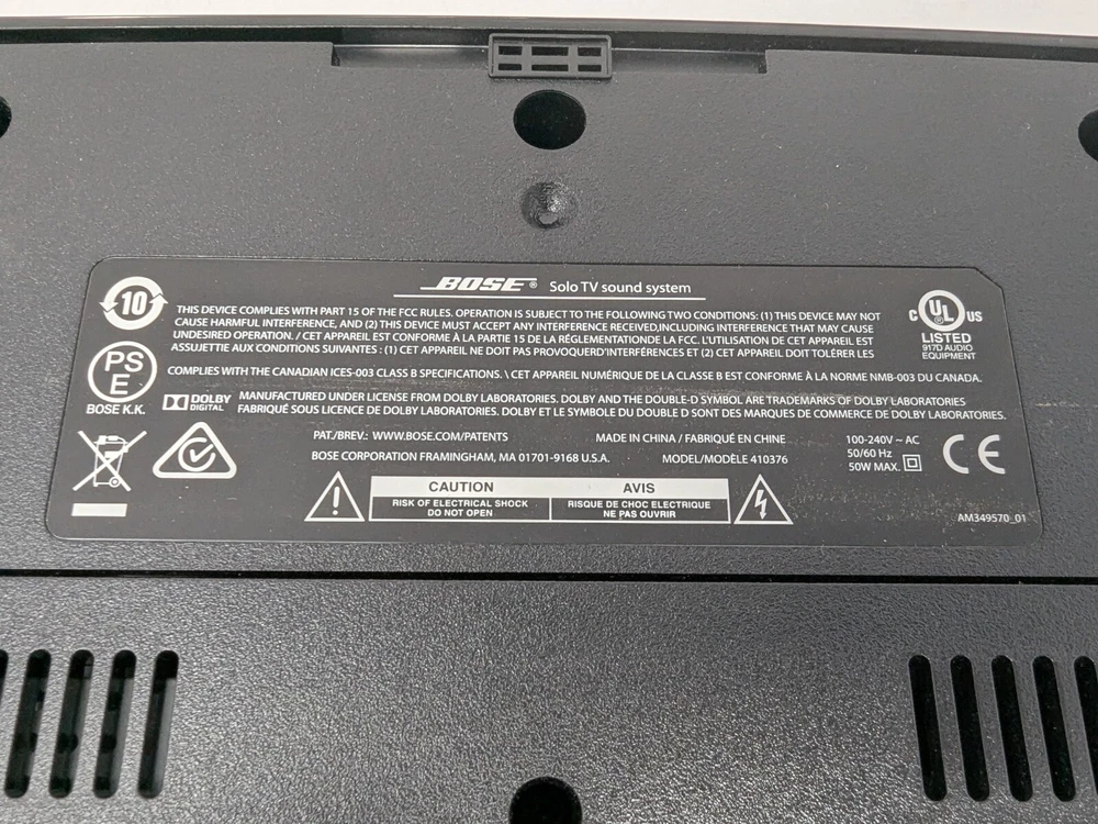 Seller Notes:“Unit with power cord, and remote, tested”MPN:410376System Configuration:2.0 SystemConnectivity:Wired, Bluetooth/WirelessShape:RectangularAudio Inputs:Digital Coaxial RCA, Digital Optical TOSLINK, Stereo L/R RCA, 3.5 mm InputColor:BlackUPC:0017817587013Type:SoundsystemBrand:BoseModel:Bose Solo 410376gtin13:0017817587013