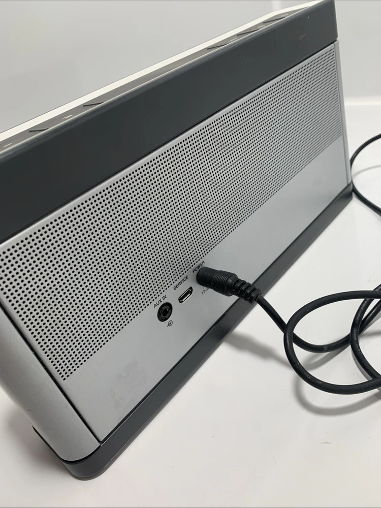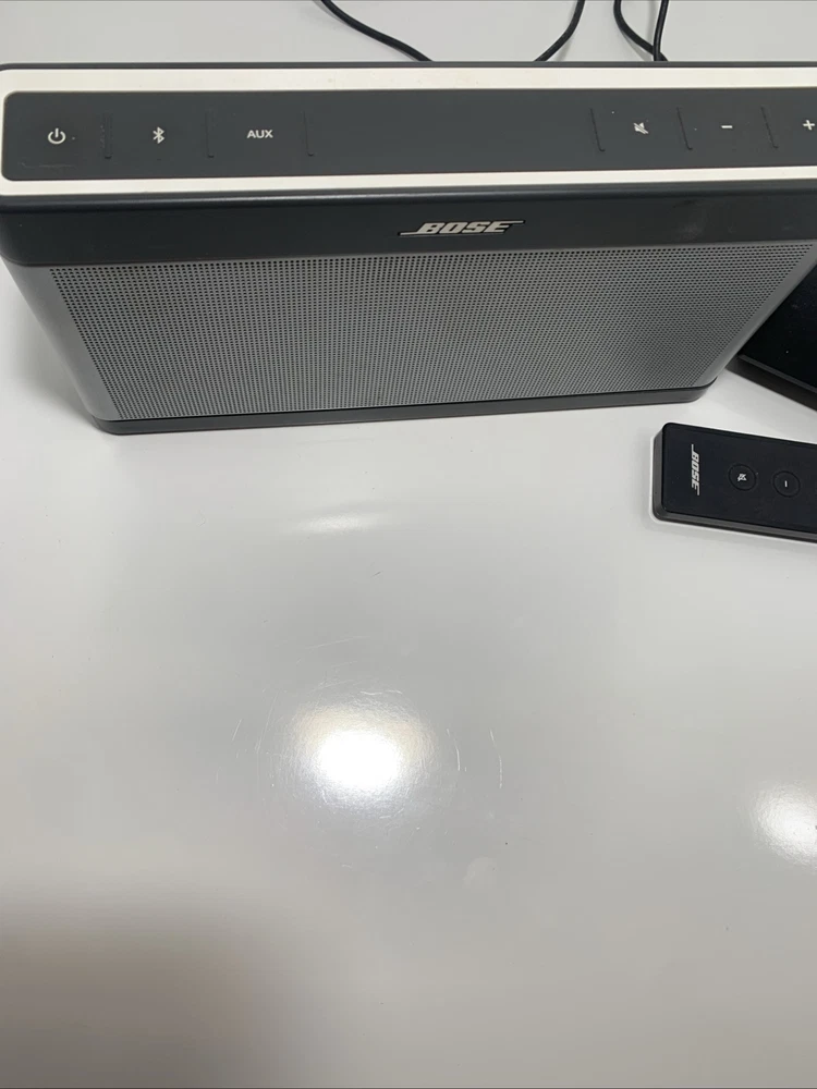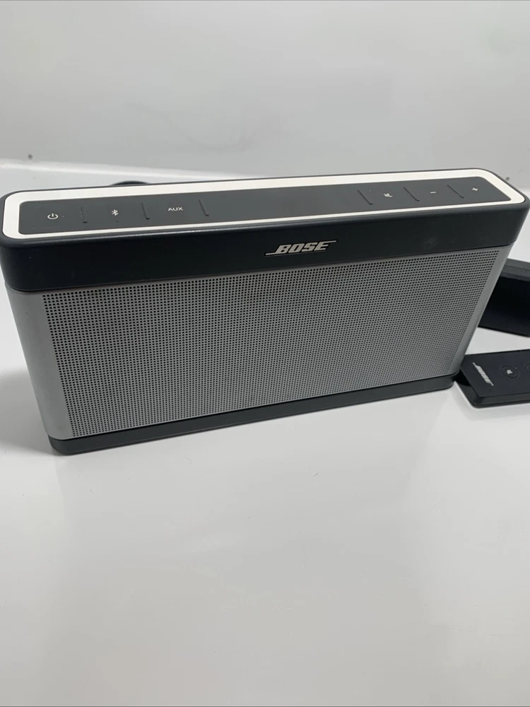 bose soundlink 3 it sounds amazing as bose always does works with plug in or it’s fully charged also comes with remote might need battery for remote. but bluetooth works perfectly it’s an amazing speaker.