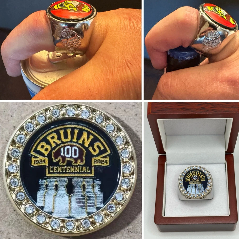 Celebrate a century of hockey glory with the Boston Bruins Centennial deCAPitator Ring bottle cap and can tab opener, a unique collectible for any die-hard fan. Crafted by Brassa Inc., this multi-colored replica championship ring is a nod to the iconic achievements of the franchise and the spirit of the National Hockey League's regular season. This unisex adult piece, sized at 6-15 with a ring sizer for a perfect fit, is not just a piece of memorabilia but a tribute to the 100 centennial year. Proudly manufactured in the United States, it holds a special place in any collection, capturing the essence of the game and the legacy of one of hockey's greatest teams. The only branded ring in the world that opens both bottles and cans.