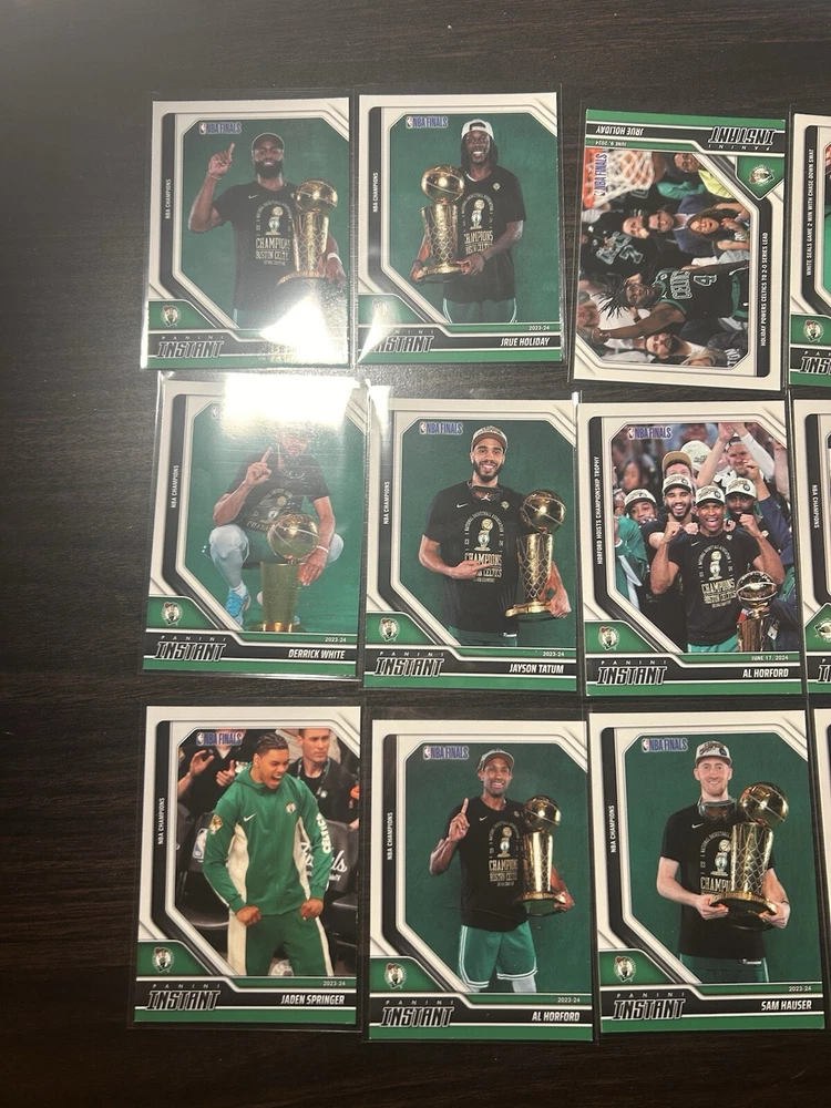 Boston Celtics 2023-24 Panini Instant NBA Finals Lot Of 21 Cards. Missing Jordan Walsh RC, Kristaps Porzingis base card, Kristaps Porzingis returns, Joe Mazzula base, Luke Kortnet base, Celtics logo Pritchard have court Jaylen brown dunk and drew Peterson RC. See photos. Feel free to send me an offer. Some cards have some corner damage