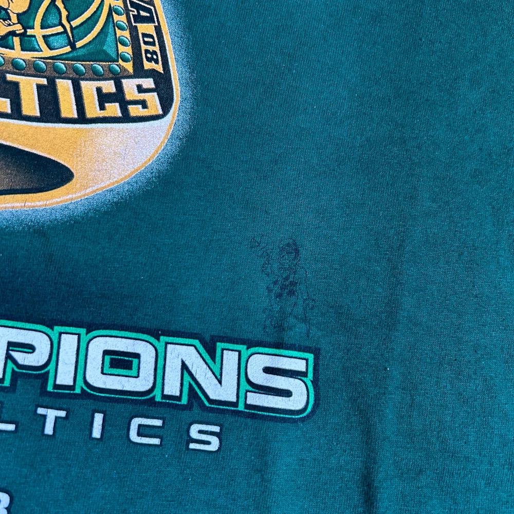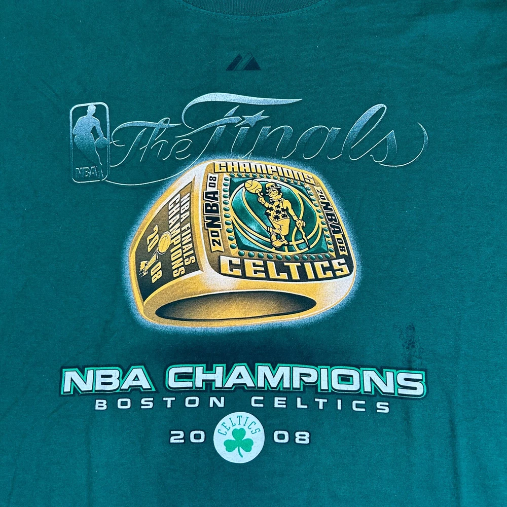 Show your love for the Boston Celtics with this 2008 NBA Finals Champions T-Shirt. The shirt features the team's iconic green color and is made of comfortable, high-quality material. It is perfect for any basketball fan, especially those who support the Celtics. This shirt is a great way to show your team spirit and commemorate the Celtics' victory in the NBA Finals. It is available in size XL and is suitable for men. The shirt is produced by Fruit of the Loom and is an officially licensed NBA product.