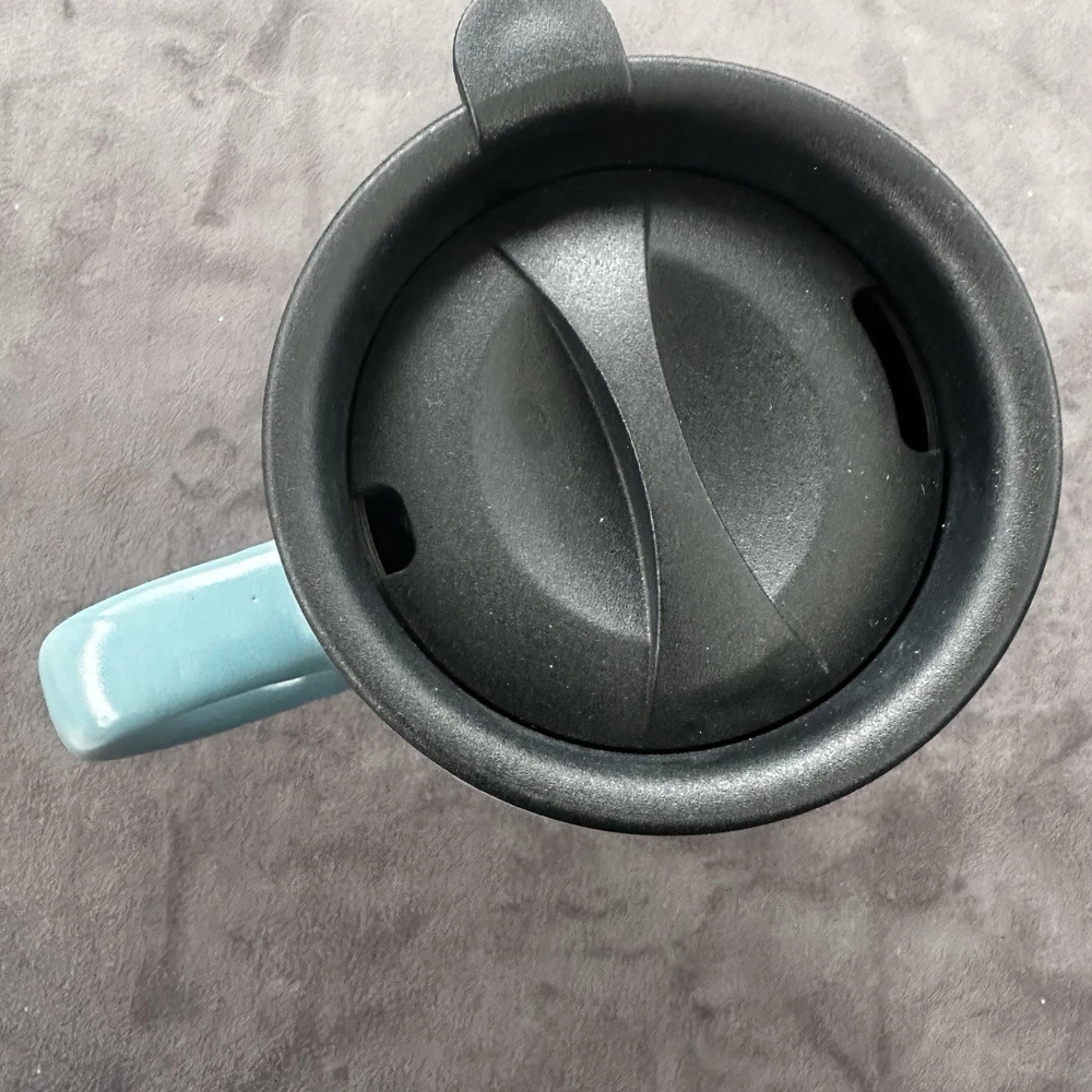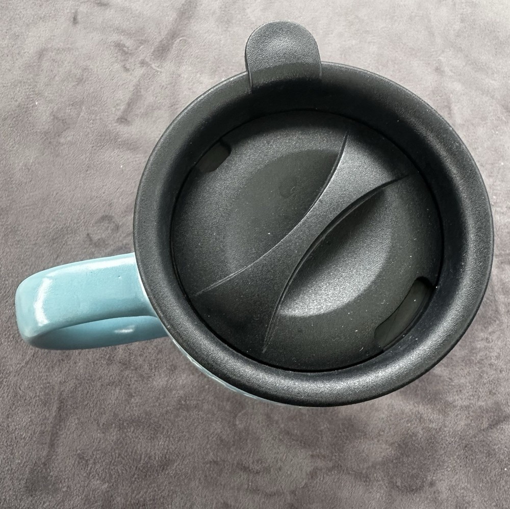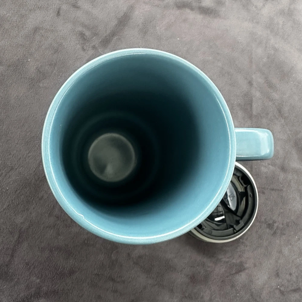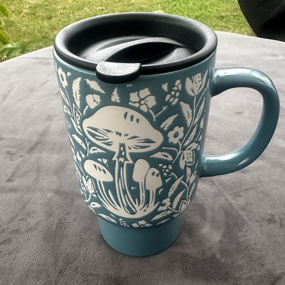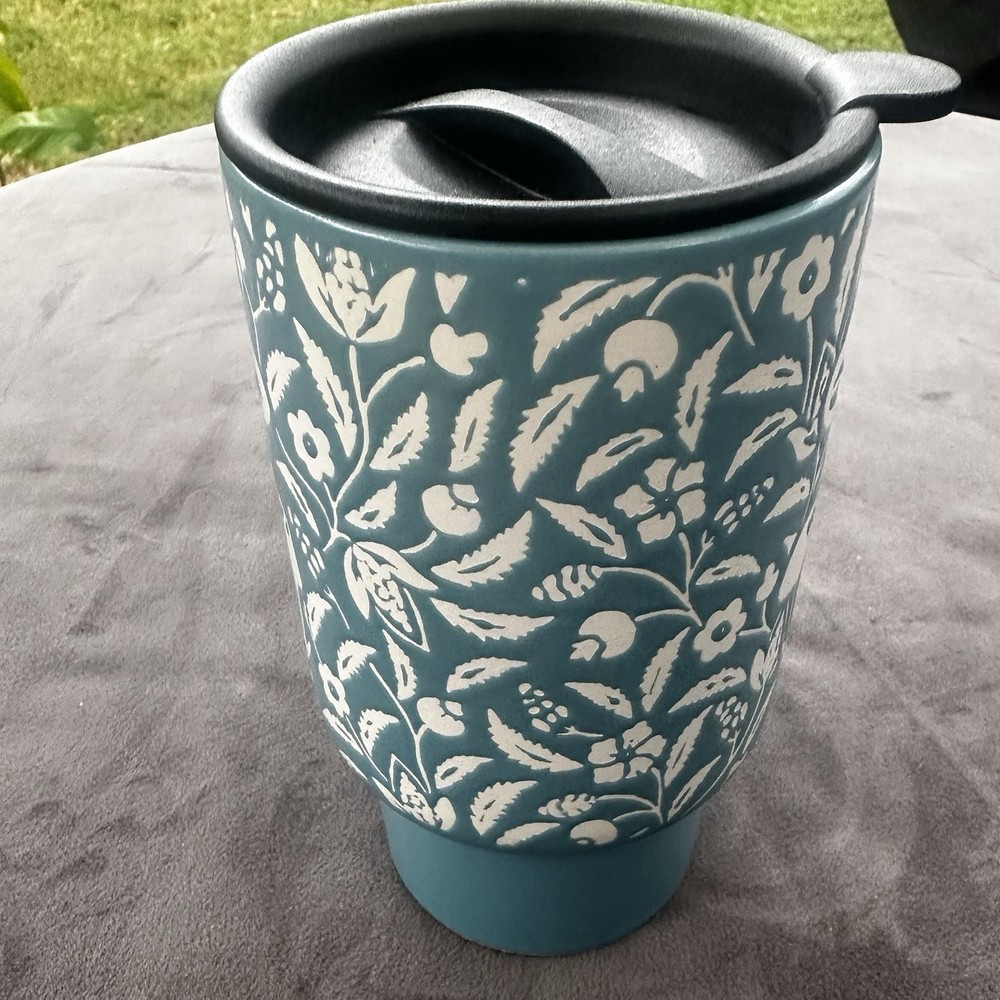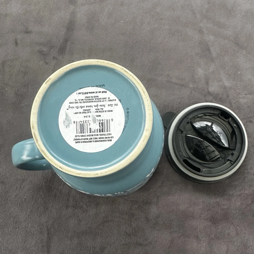 A NEW Boston Warehouse Trading Company Blue and White Tumbler Travel Mug. A stylish and practical two-piece set featuring a stoneware cup with a capacity of 18 fl oz, perfect for hot tea, coffee, or hot chocolate. The mug has a charming mushrooms and foliage pattern in blue and white. Made from durable stoneware and BPA-free plastic, this travel mug is both microwave and dishwasher safe for easy use and cleaning.