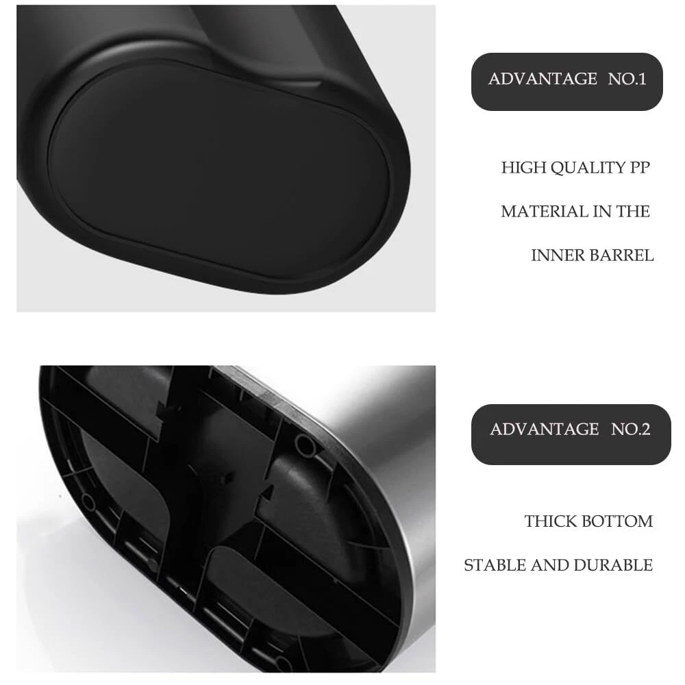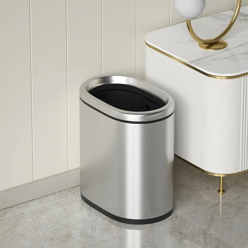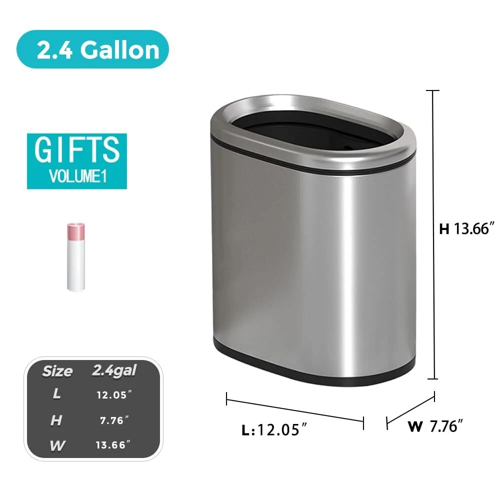 Narrow design:The oval shape makes this trash can both practical and beautiful,This is a perfect narrow trash can,Perfect for bathroom use. Fashionable appearance:The simple and stylish exterior design is suitable for various home styles and enhances home aesthetics. Product Material:The trash can is made of high-quality stainless steel material, the appearance is simple and fashionable, the appearance is smooth, and it is very modern. Protects Your Flooring:The rubber feet pads on the bottom of the trash can will help prevent scuffs and scratches to your floor Easy to Clean:Trash bin,The bottom is heightened to reduce wear and prolong the service life. The surface frosted texture is wear-resistant and scratch-resistant Perfect ERFECT Size:Bathroom Trash can, 12.05 x 7.76 x 13.66(inches), 2.4 gallon/9 L