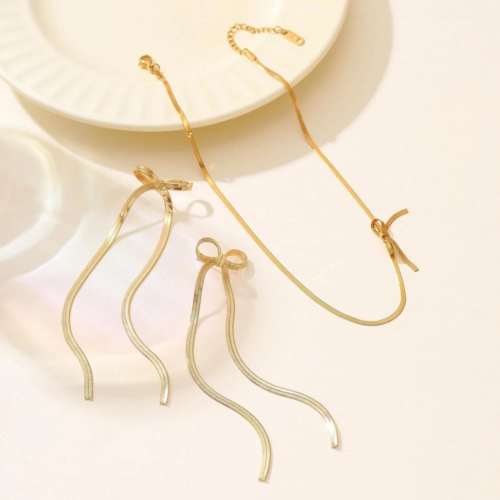 Bow Dangle Choker Necklace Set for Women Long Tassel Chain Earrings Dainty Gold Snake Chain Necklace Wedding Prom Fashion Jewelry Set Gifts Product Details Product Dimensions : 3.15 x 2.36 x 0.2 inches; 0.32 ounces Department : womens Date First Available : November 23, 2023 Manufacturer : Yewkit Brand, Seller, or Collection Name: Yewkit Metal stamp: 18k Metal: titanium and platinum Material: Brass Gem Type: No Gemstone Item Length: 3.15 inches Clasp: Lobster Clasp