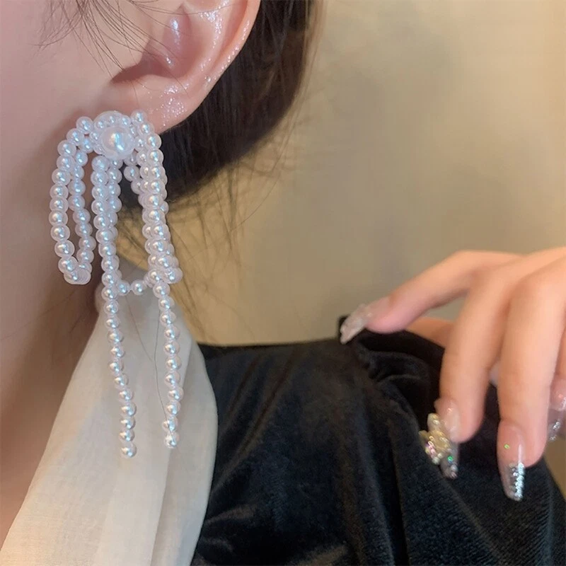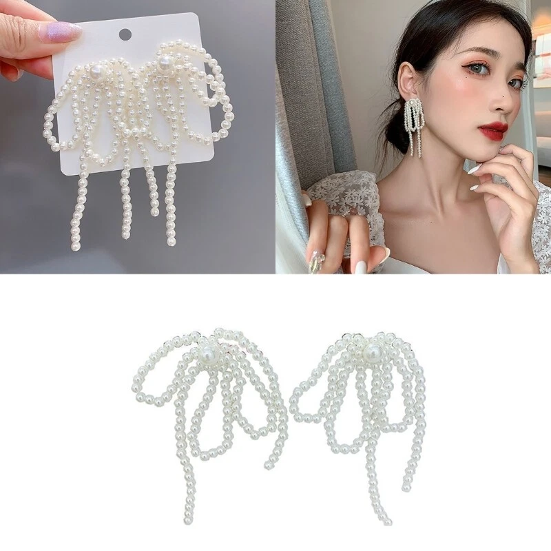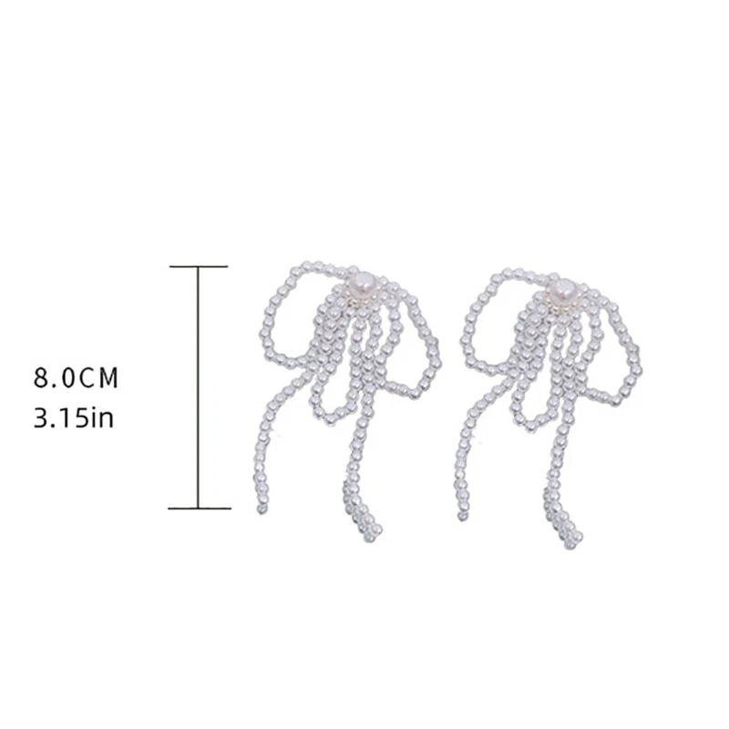 Features: Add a touch of elegances to your look with these handmade earrings featuring a bows and delicate beads. for enhancing any outfit. These meticulously crafted earrings combine the beauty of pearls with a trendy designs, offering a versatile option for accessorizing various outfits. A must have accessory for fashion forward individuals. Designed for women who appreciate contemporary styles, these earrings are suitable for fashion conscious females of all ages. Wear them confidently and make a statement wherever you go. Whether it's a formal event or a casual outing, these long earrings are the choice to complement your overall look. your unique of with these korean earrings. Treat yourself or someone special with these exquisite earrings. Their delicate designs exudes femininity, making them a wonderful any occasion. Specifications: Pearls Weight:About 8g Size: As picture shows Package Includes: 1 Pair Earrings note: 1.Please allow 1-2cm errors due to manual measurement, make sure that you do not mind before you order. 2.Due to the difference between different monitors, the picture may not reflect the actual color of the item.