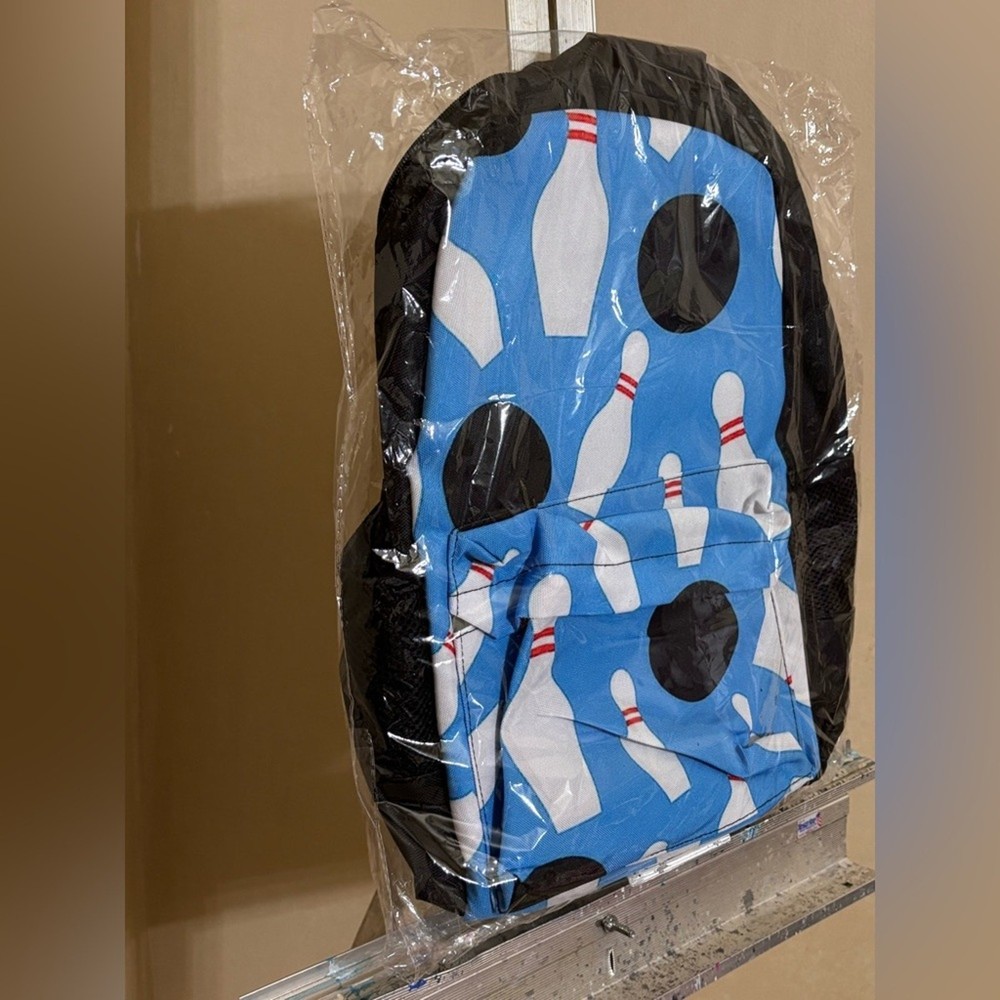 This bowling pin pattern backpack is brand new and still in its original packaging! It's a versatile sport backpack that can be used for bowling, travel, or as a laptop backpack for business or college. The backpack features an anti-theft design, ensuring your belongings stay safe and secure. It makes a great gift for men and women alike!