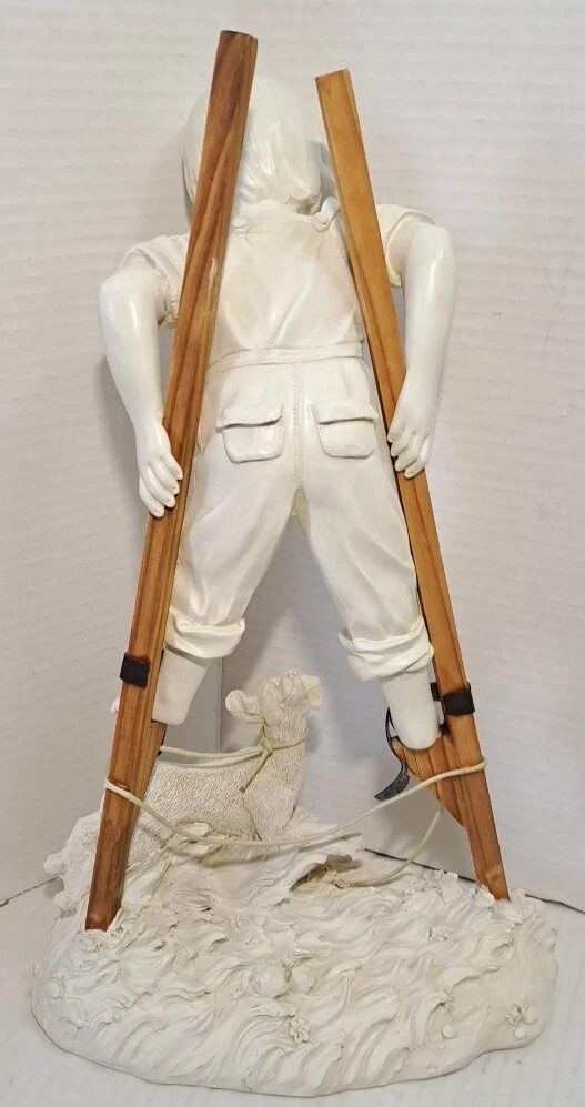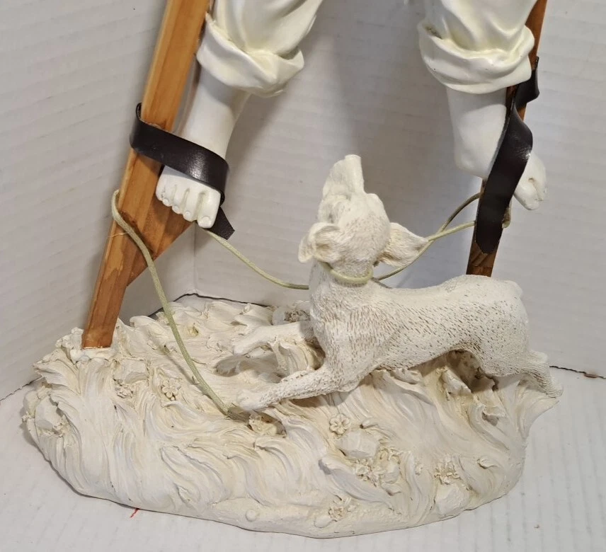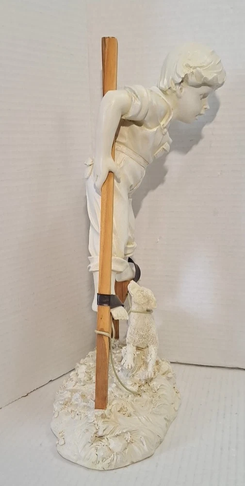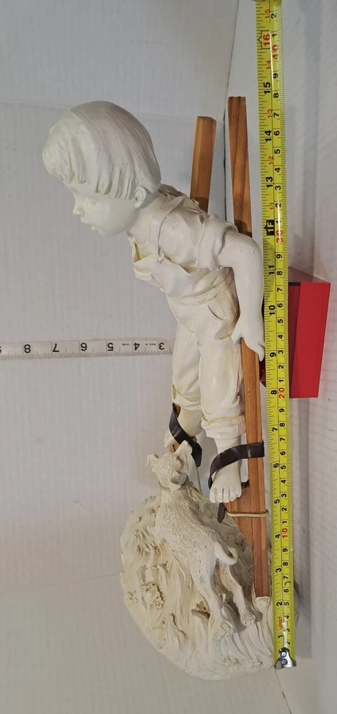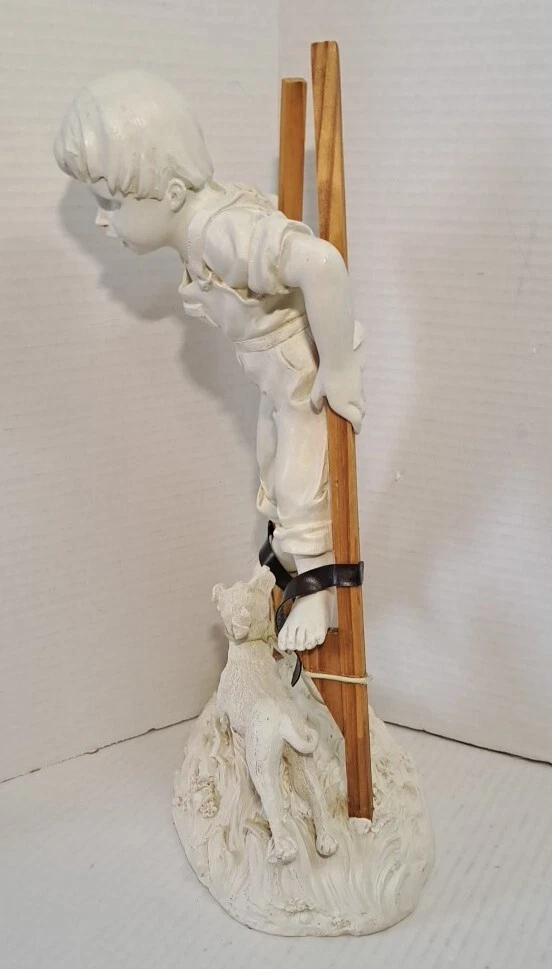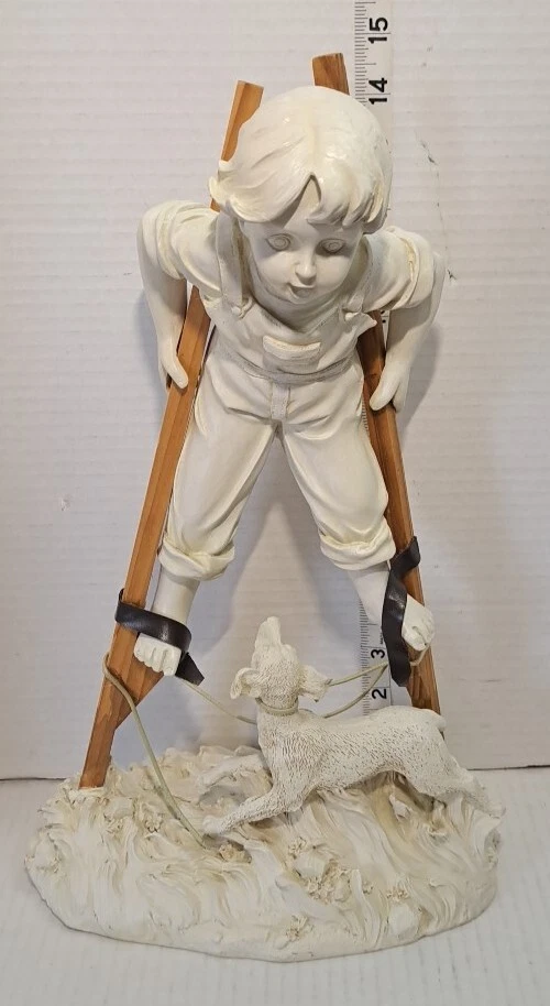 Child Playing Puppy Figure Boy On Stilts With Dog Statue See photos for measurements I believe this a molded resin I consider this to be in good preowned condition Please view all photos zooming in on them as they are part of the description for you to judge condition This is a heavier item so shipping cost reflects this