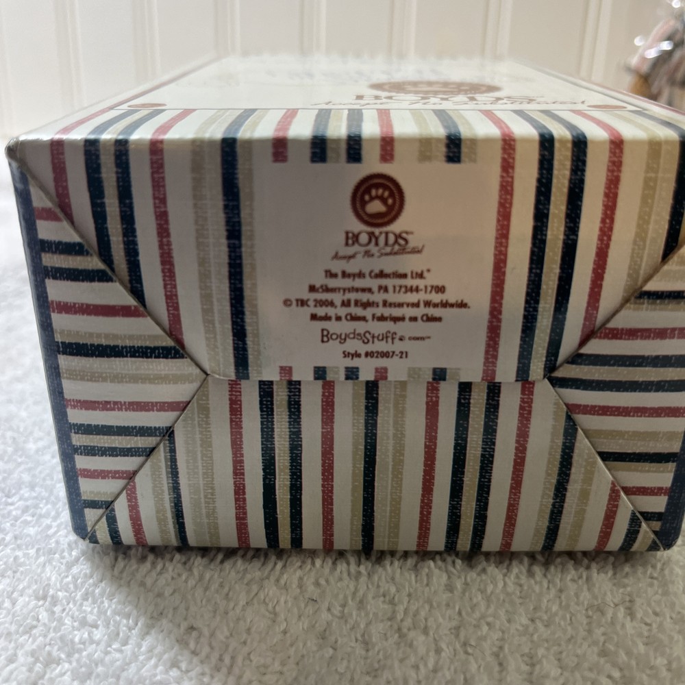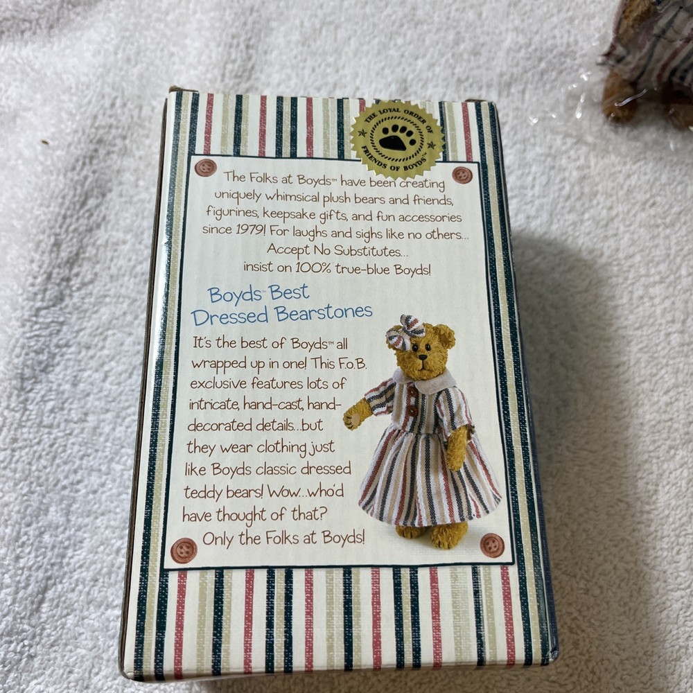 Year Manufactured:2007Number of Items:1Time Period Manufactured:2000-2009Brand:BoydsUPC:Does not applyAnimal Species:BearColor:BrownStatus:RetiredCountry/Region of Manufacture:ChinaAntique:NoCollection:Friends of BoydsType:Resin BearAnimal:BearItems Included:DressItem Height:6 inSize:6 ingtin13:Does not apply