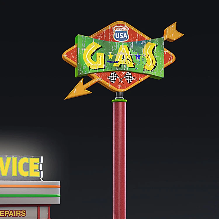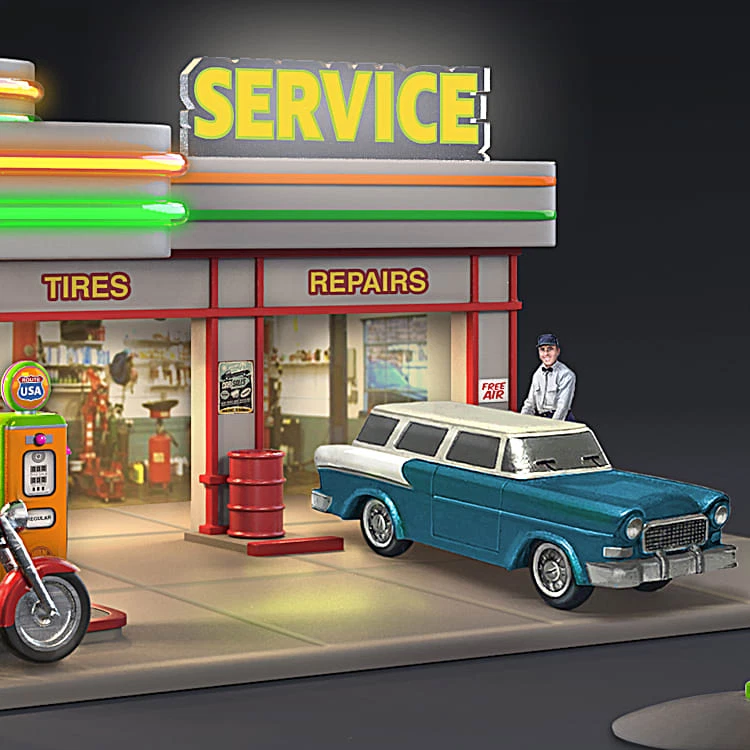 This exclusive collectible illuminated gas station sculpture from The Bradford Exchange features: Evoke the nostalgic feel of classic American road trips with the Route U.S.A. Gas Station Sculpture, a first available exclusively from The Bradford Exchange, Hawthorne Village Division Meticulously handcrafted with artist's resin, this illuminated gas station sculpture is set upon a fully sculpted display base with fueling pumps, vending machines and signage inspired by gas and car service advertisements Lights up! Retro-style, neon-like lighting illuminates around the station and the "ROUTE USA" sign, while the station interior and exterior also lights up Fully sculpted, hand-painted vintage vehicles (which fit in the garage bays) and gas attendant figures are removable, giving you the joy to arrange the scenes to your liking A standing gas sign is posed separately, and has a "weathered" look for period authenticity Vintage-inspired retro-style gas station sculpture makes a fine addition to any 1950s decor Certificate of Authenticity Measures approximately 8-1/2" W x 4-1/2" H x 8" D; 21.6 cm W x 11.4 cm H x 20.3 cm D
