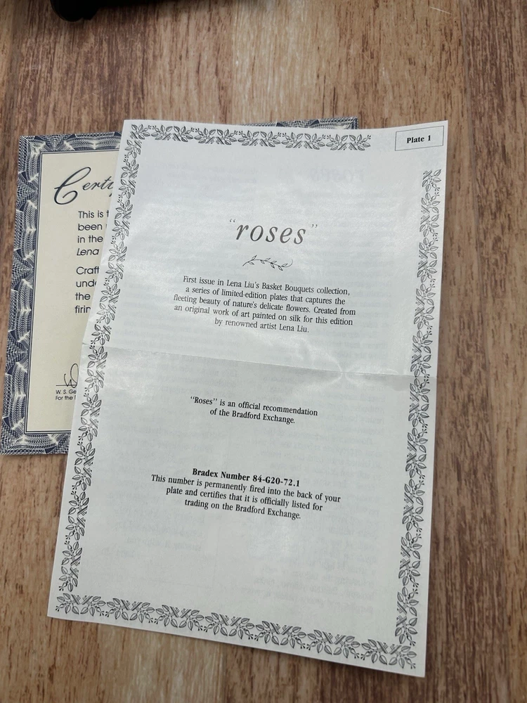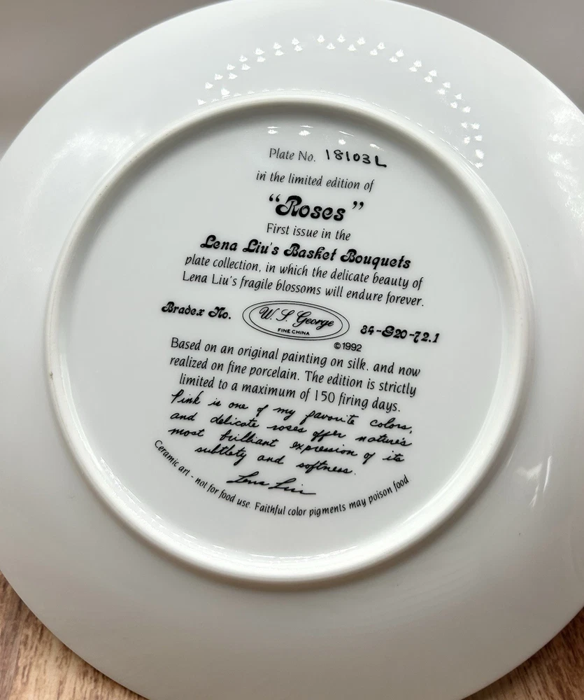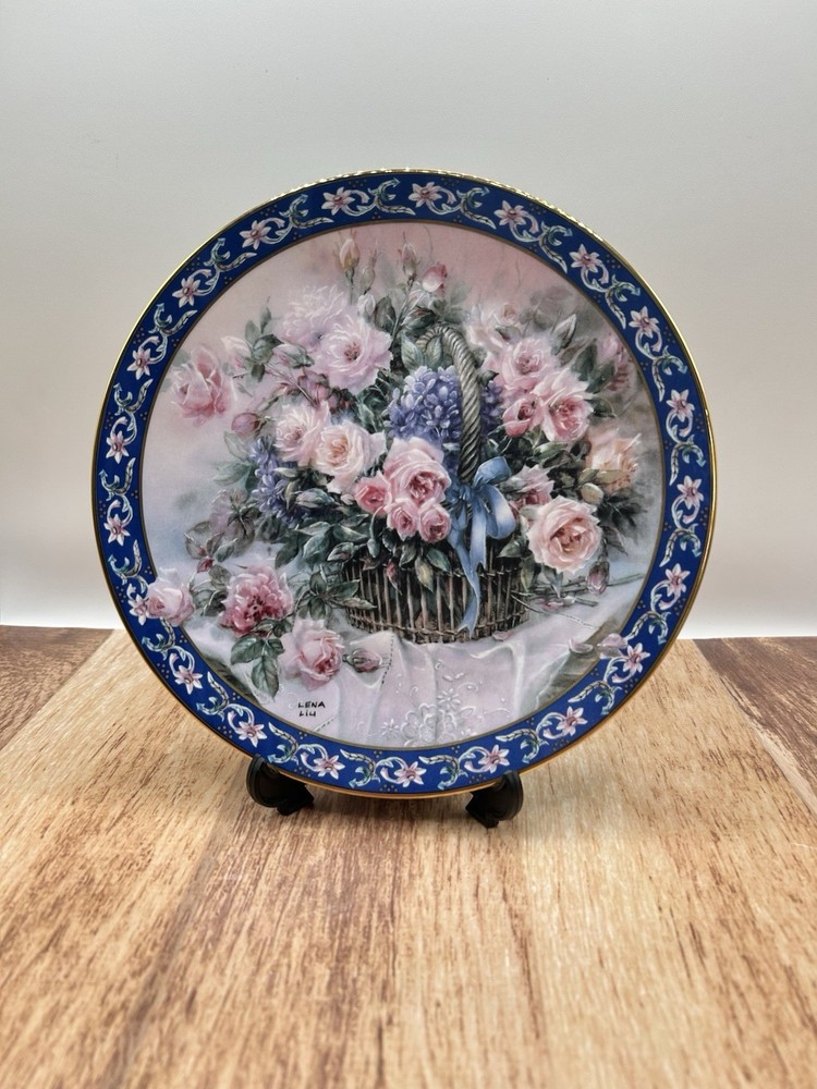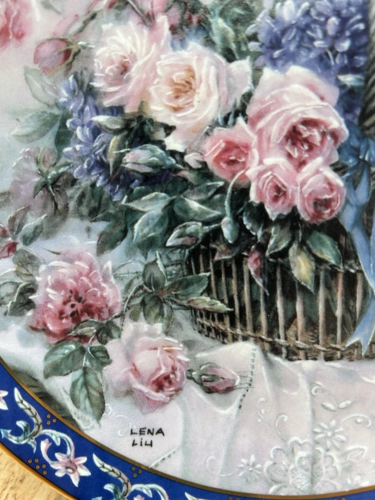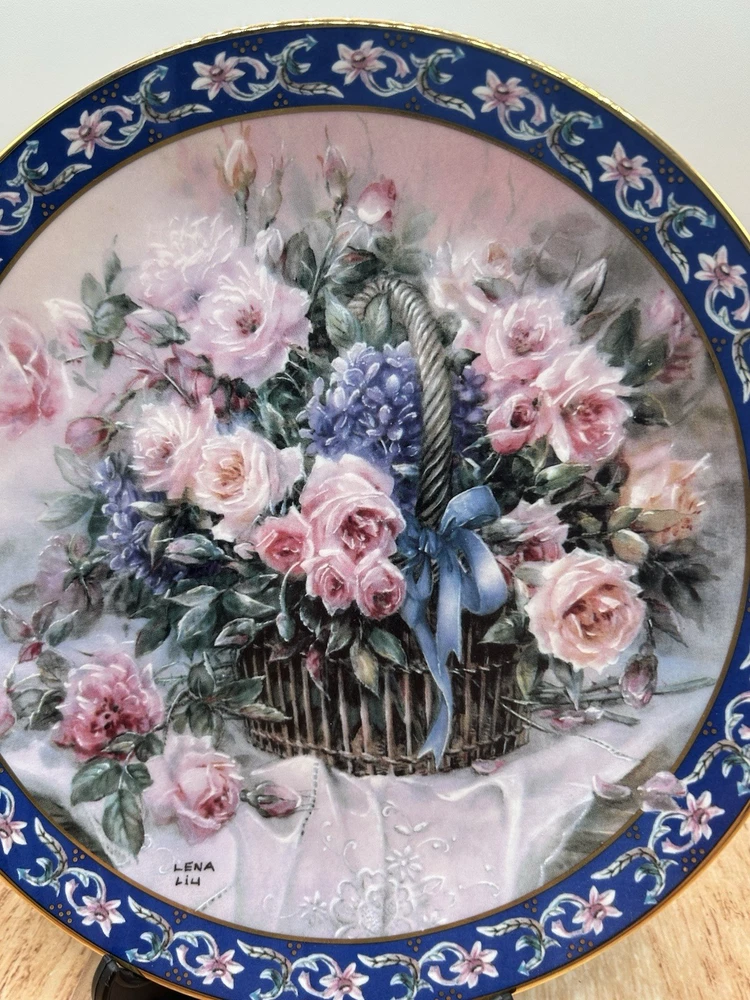 Vintage 1992 Bradford Exchange Collector Plate This plate is part of Lena Lui’s Basket Bouquets and is titled “Roses” and numbered 18103L It comes with its certificate of authenticity and original box It measures approximately 8.25” in diameter and is in good condition