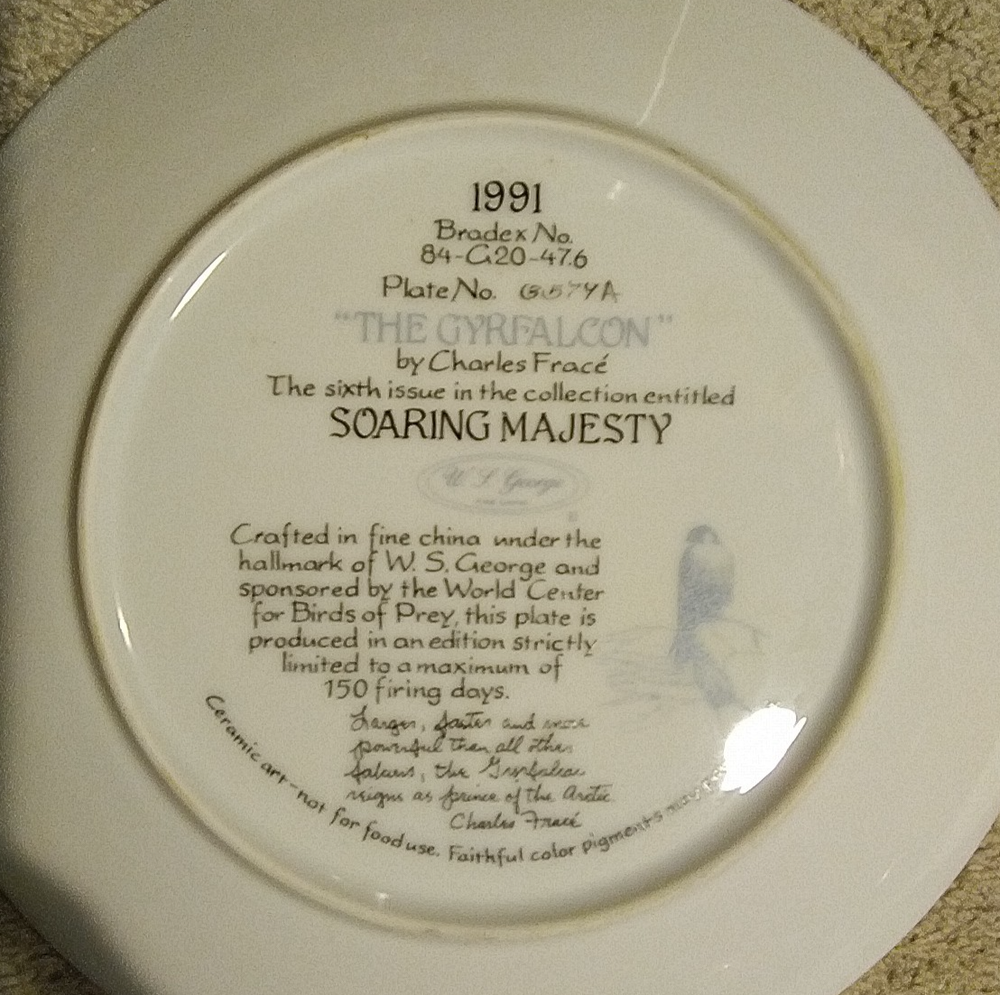 $ 5.19Bradford Exchange Peregrine Falcon Soaring Majesty Plate by Charles Frace 1991