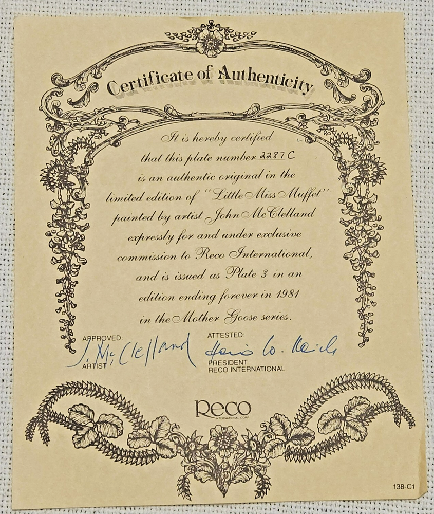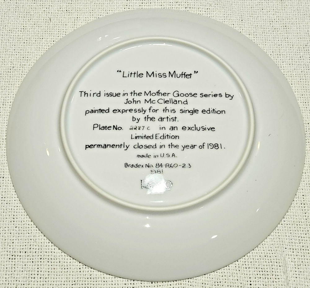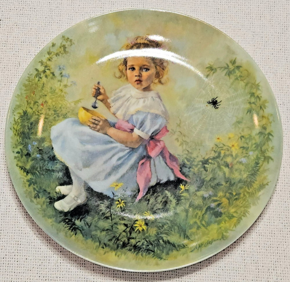 Delve into the whimsical world of nursery rhymes with the Bradford Exchange Little Miss Muffet Collector Plate. This 8.5-inch round bone china plate showcases the beloved character in a vibrant, graph print pattern, bringing a touch of childhood nostalgia to any collection. Crafted in the United States during the 1980s, it's a delightful piece of decorative art pottery that celebrates American culture. With its multicolored design and fused glass production technique, this collector's item is a testament to the timeless charm of classic stories. Perfect for all occasions, the plate is date-lined, making it not only a decorative piece but also a slice of history from the late 20th century. Whether you're a fan of Mother Goose or a connoisseur of vintage decor, this piece is sure to be a treasured addition to your home or collection.