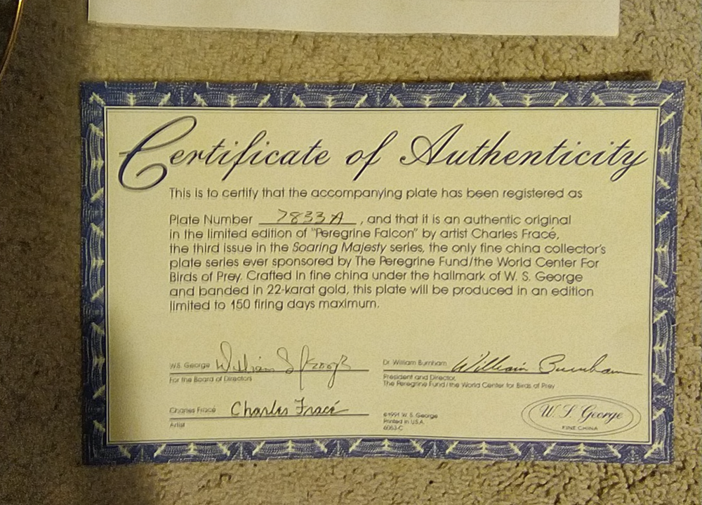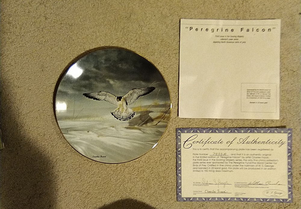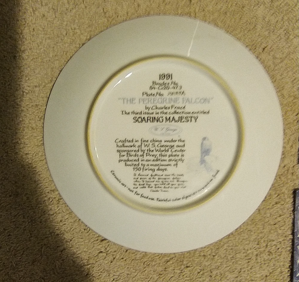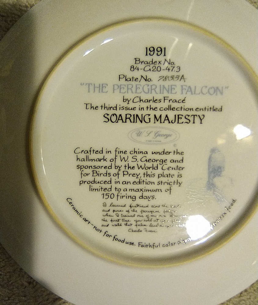 The Bradford Exchange Peregrine Falcon Soaring Majesty Charles Frace Plate from 1991 is a round ceramic collector plate featuring a bird theme. This decorative piece measures 8.5 inches in diameter and comes with a stand. The multicolor plate showcases a wild animal design typical of American culture, making it a unique addition to any collector's set from the late 20th century. The art pottery production style adds a touch of craftsmanship to this vintage collector's item. You Will Receive The Item(s) Pictured. We Do COMBINE SHIPPING So Take A Look At Our Other Items. If You Would Like To Take Advantage Of The COMBINED SHIPPING Please Wait For Invoice Before Payment. If You Have Any Questions We Will Be Happy To Answer Them.