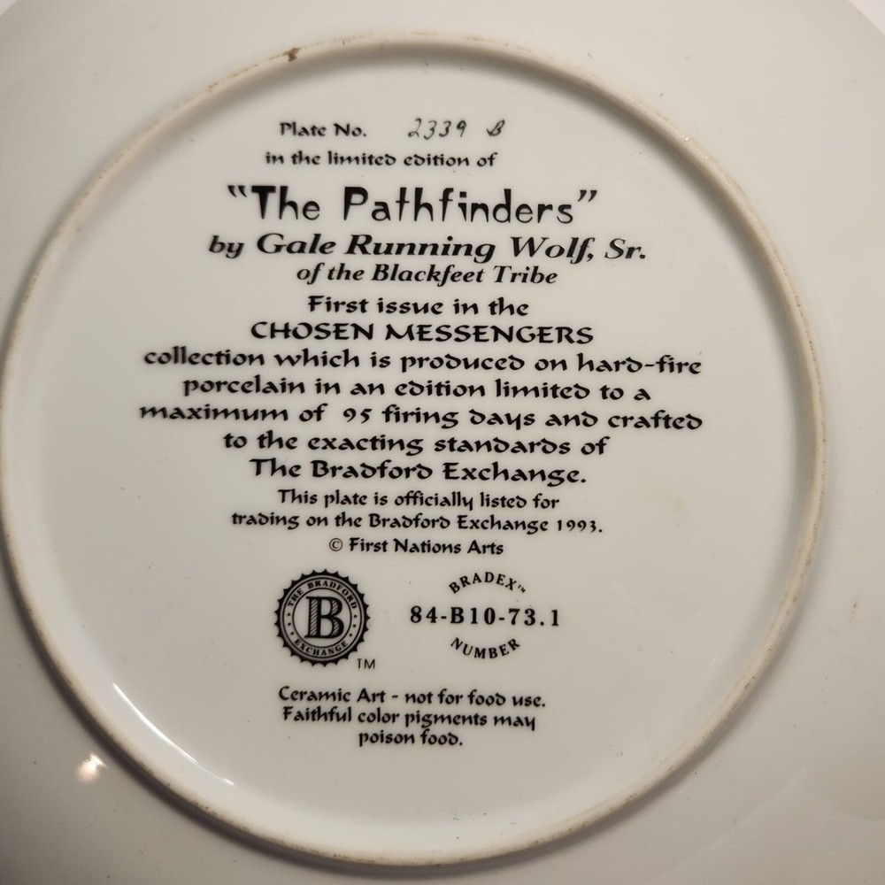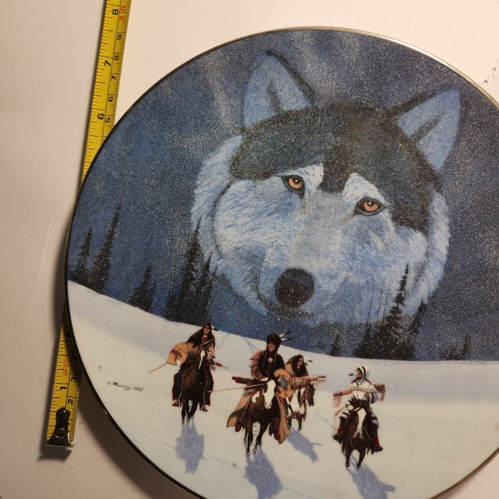 This collectible porcelain plate showcases a striking design by Gale Running Wolf Sr., featuring a wolf's face and Native American riders. Crafted in limited edition with fine detail, it reflects the artistry of the Blackfeet Tribe and Bradford Exchange's high standards. • Limited edition: 2339B with a maximum of 95 firing days • Made of fine hard-fire porcelain • 8.5" diameter • Not food safe; decorative use only • Bradford Exchange certified Diameter = 8.5 inches.