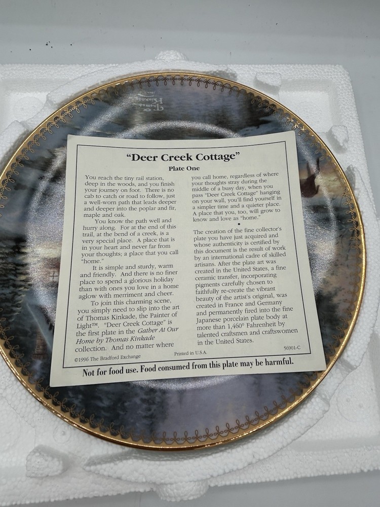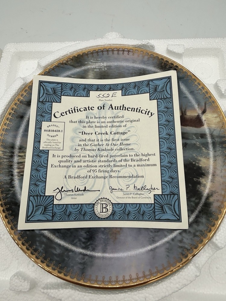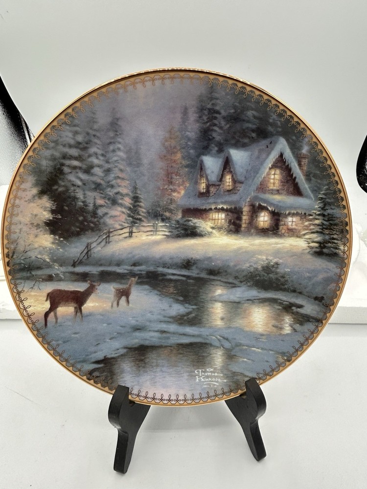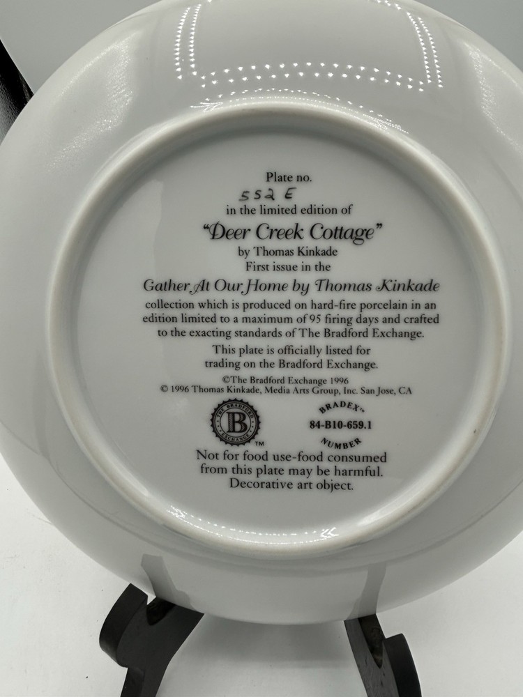 The Bradford Exchange Thomas Kinkade Deere Creek Cottage collector plate is a beautifully crafted piece of art pottery featuring a multicolor design of a charming cottage scene. Produced in California in the 1990s, this collector's item reflects American culture and craftsmanship. Made of porcelain using traditional pottery techniques, this unique plate from a reputable brand like Thomas Kinkade is sure to be a treasured addition to any collection of decorative collectibles. Comes with a Certificate of Authenticity and in its original Styrofoam plate holder.