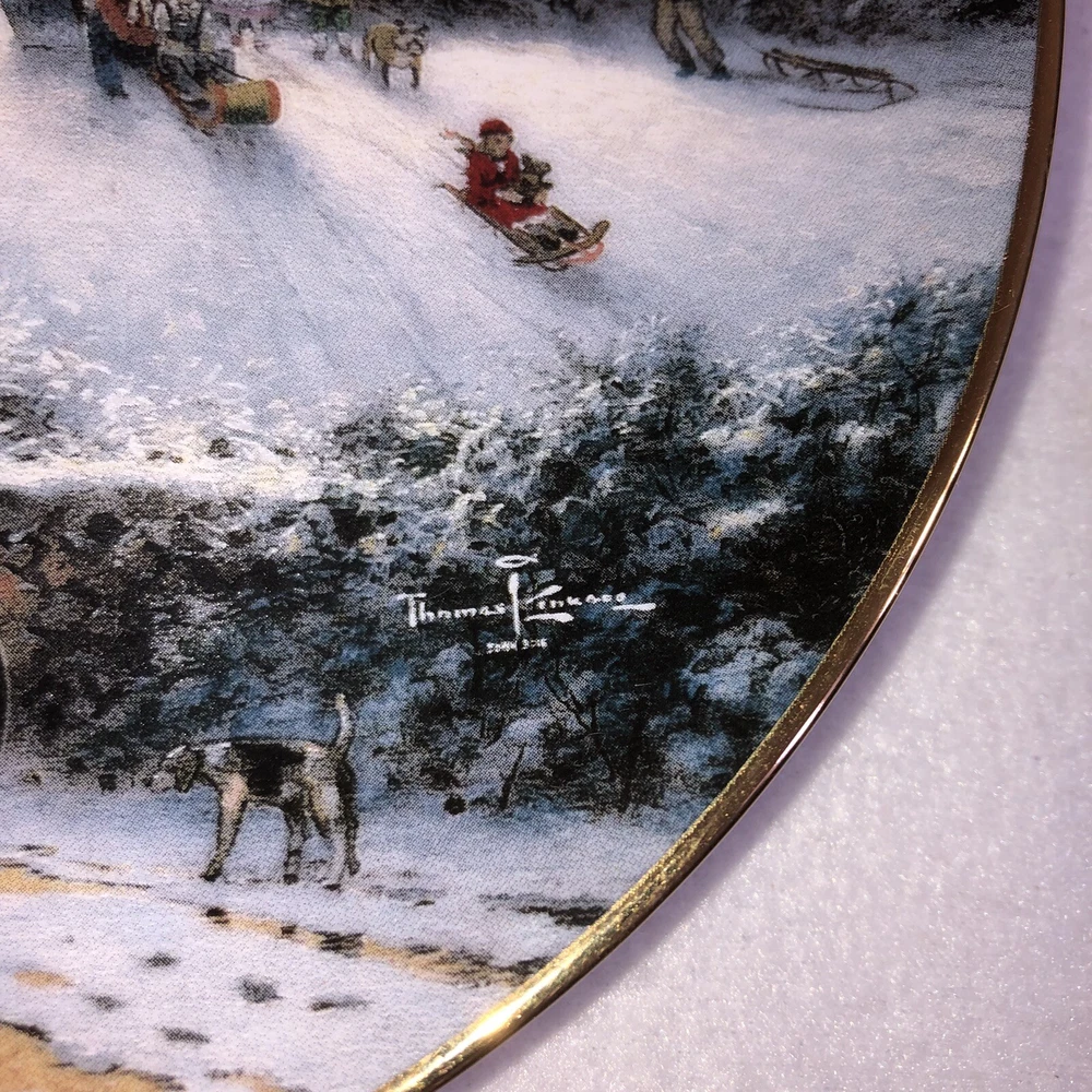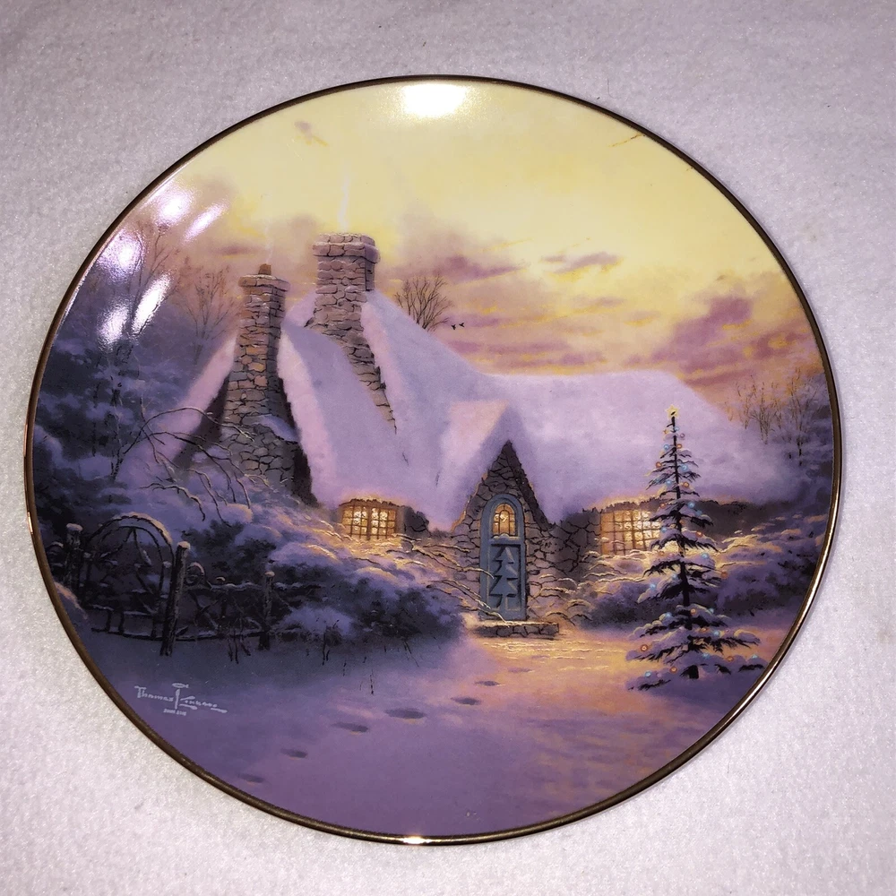 This is a stunning lot of 4 Bradford Exchange decorative plates by Thomas Kinkade. These plates are from his "An Old Fashioned Christmas" series. They date from 1993 and 1994. Included in the lot are: -1993 All Friends Are Welcome, the first issue in the series. The plate is numbered 10236E and has a BRADEX NUMBER of 84-B10-030.1 - 1993 Winter Memories, the second issue in the series. The plate is numbered 16598A and has a BRADEX NUMBER of 84-B10-030.2 -1994 Christmas Tree Cottage, the fourth issue in the series. The plate is numbered 5990A and has a BRADEX NUMBER of 84-B10-030.4 - 1994 The Best Tradition, the fifth issue in the series. The plate is numbered 7739A and has a BRADEX NUMBER of 84-B10-030.5 The plates are edged in a gold trim and measure approximately 8 inches. They are in good vintage pre-owned condition. There are no nicks, chips, cracks or repairs. Gold trim shows little to no wear. These no longer include their original boxes or certificates. This is a plates only listing. Please review and enlarge all photos for additional details, views and measurements. Shipped via USPS Ground Advantage.