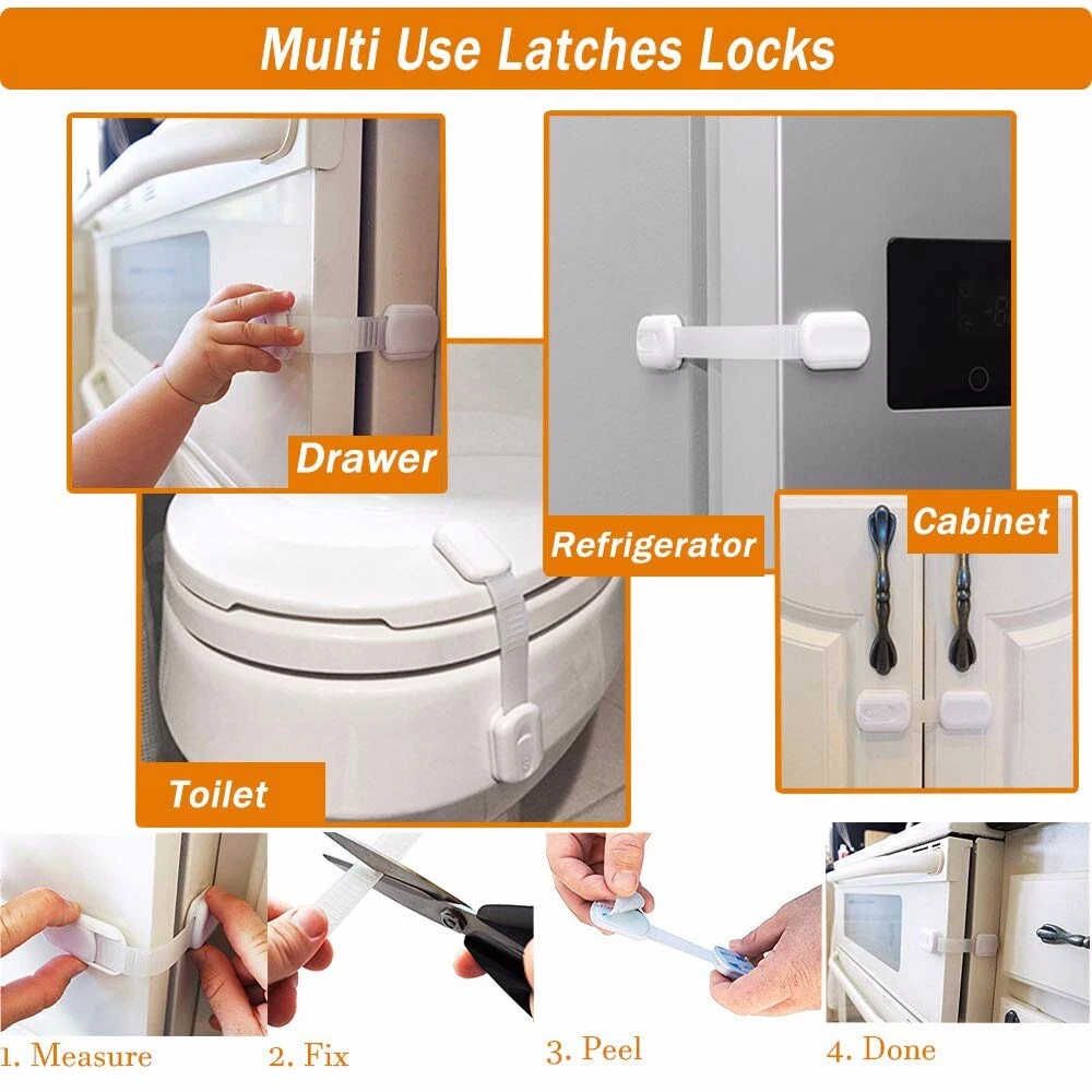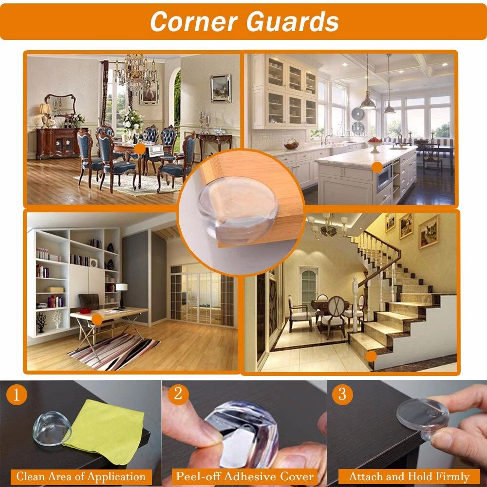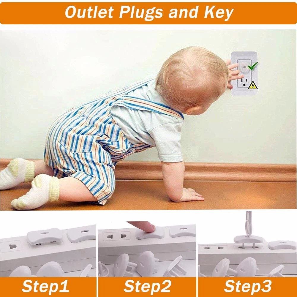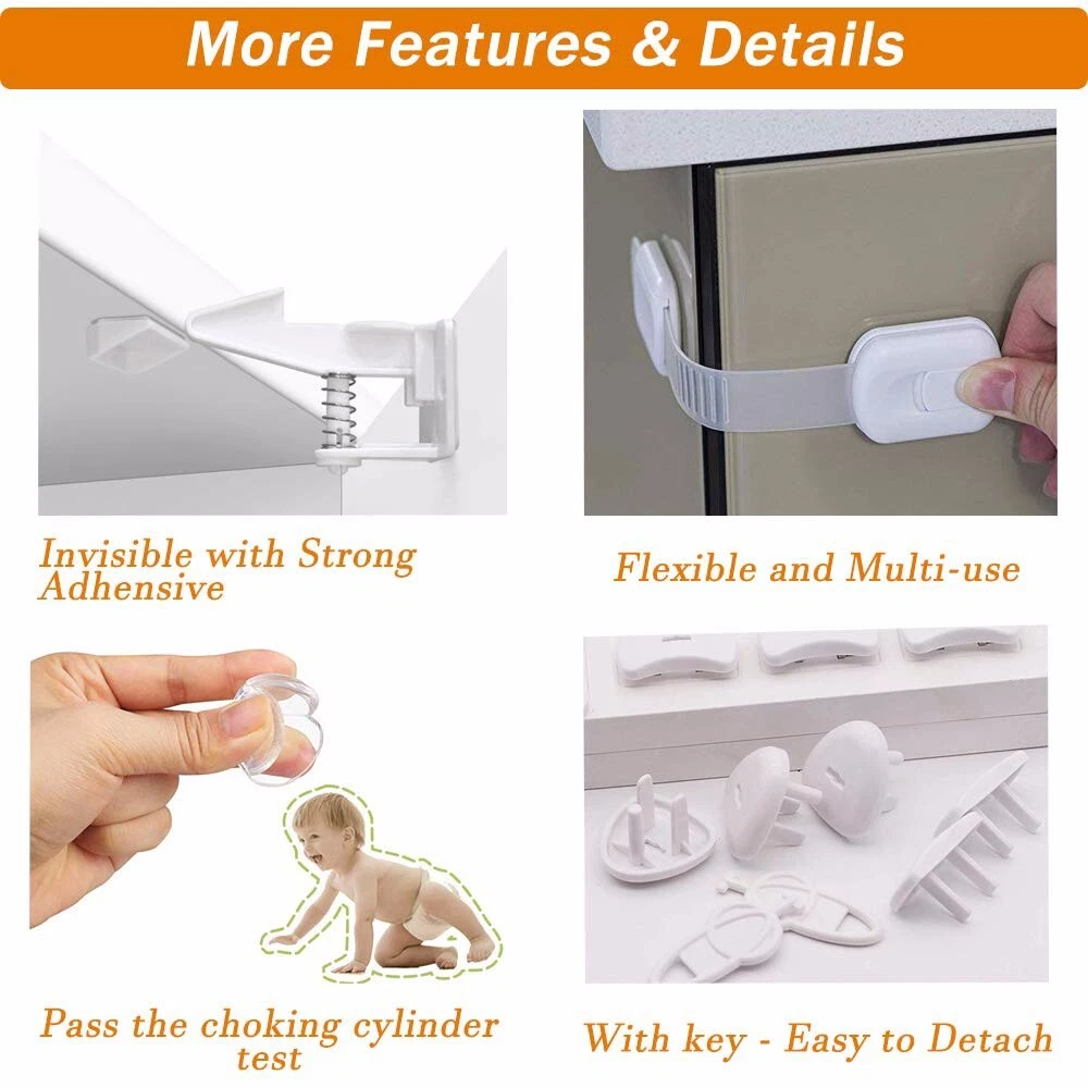 High Quality Safe Material & Best Gift - 100% safe for children, BPA free. With environmental plastic and 3M adhesive material, make our baby proofing kit more durable, it’s also a great gift for baby shower. 12 NEW GENERATION CABINET LOCKS & BARS - Strong, Safe & Smart design, The EXTRA strong cabinet locks are designed to prevent smart toddlers or child from opening a cabinet lock or drawers. Utilizing the strongest 3M adhesive tape, you can trust the latch will stay secure. You can place all 12 locks throughout the house in minutes without trouble “corrector”. 14 CLEAR CORNER GUARD- 100% NON-TOXIC and SAFE FOR YOUR BABY- Our corner guards are made of MEDICAL GRADE PVC, which is DOP/DEHP free. Suitable for right-angled "corner" tables, chairs, cabinets, etc. - Can protect walls and furniture when move - clear corner guards keep your kids from the injury of the sharp corner and keep your furniture always the same. 6 MULTI-USE BABY SAFETY LOCKS - Flexible, adjustable length strap works on both flat surfaces and around corners. 7" baby safety cabinet locks, install easily in seconds. Securely shut your cabinets, drawers, appliances, toilets, trash cans, windows, pet food containers & more. Keep your little ones away from all the dangers in your home. 14 CHILDPROOF OUTLET PLUG COVERS & KEY - To meet the needs of different family and circuit structure. 6 * 3 pronged outlets covers & 6 * 2 pronged outlets. Can be used to cover the electric outlet plugs while not in use, protect small children/babies/toddlers from hazardous situations due to exposing to electric current outlet openings.