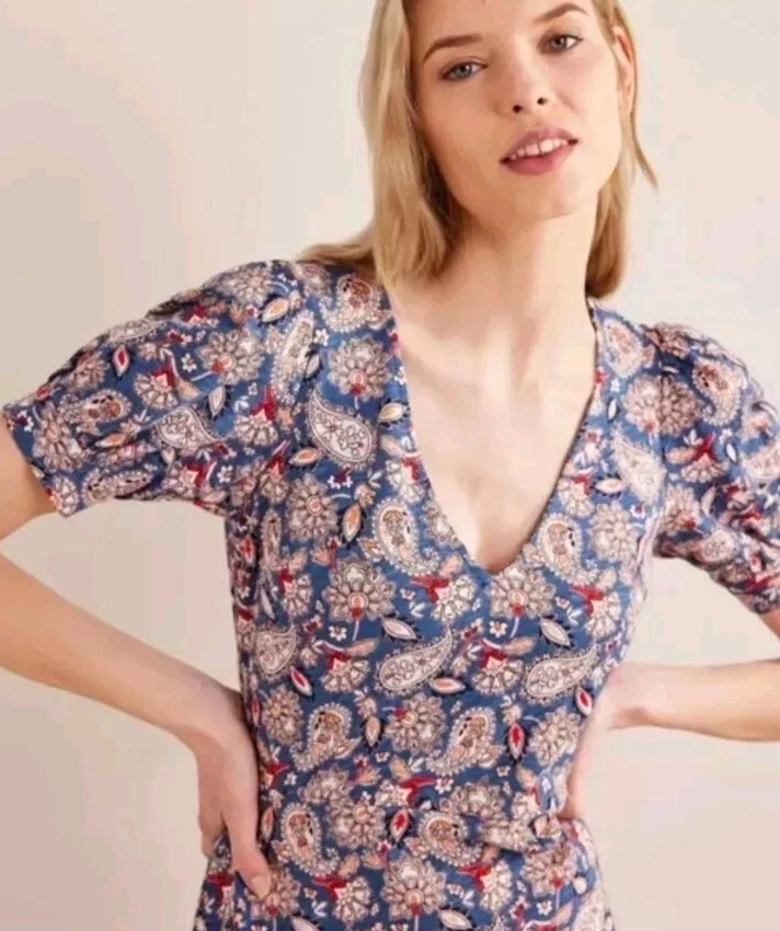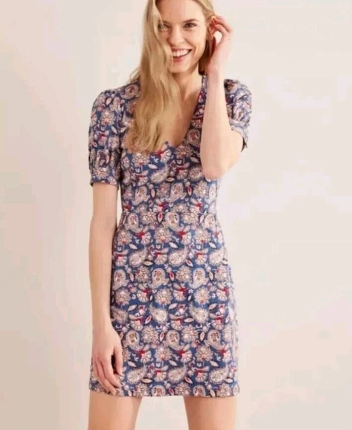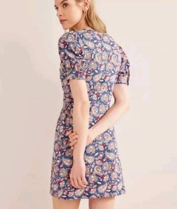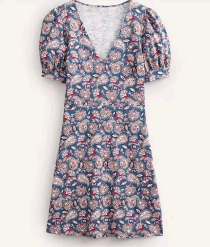 Brand New Boden Navy Paisley Terrace V Neck Mini Dress Size 14P RRP £65.00 This cotton-jersey mini dress is versatile for dressing up or down. Show off the puff sleeves by layering it under a knitted tank. 100% cotton Machine washable Semi-fitted shape Mini length Short sleeves