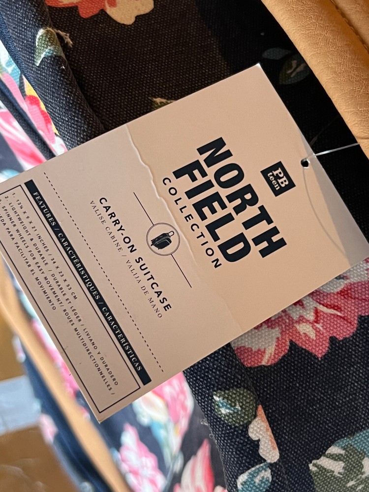 One Brand New Pottery Barn Teen Northfield Bloom Burst Carry-On Spinner DIMENSIONS Overall: 13.25" wide x 9" deep x 21" high Interior: 13" wide x 9" deep x 20.5" high Front Exterior Pocket: 11.75" wide x 14" high Interior Pocket: 16" wide x 11" high Handle (unextended): 1.5" wide x 11" long Handle Extension Heights (above top of suitcase): 9", 14", 18" Weight: 8 pounds