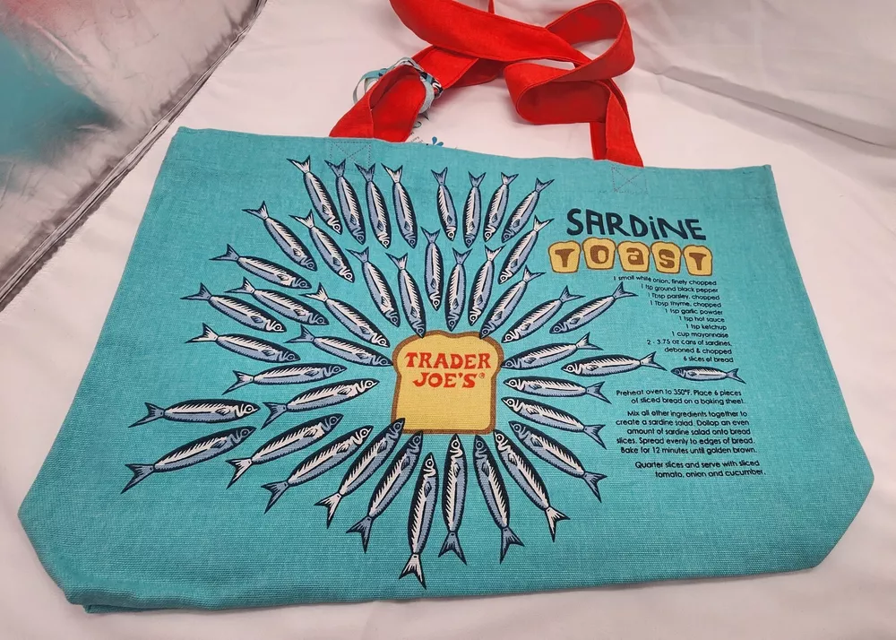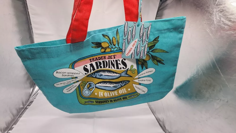 **See my other Trader Joe listings for some special bundles!** Ships same day when ordered before 6pm EST Priced to sell! Brand new, never used. With Tags. This limited edition Trader Joe's canvas tote bag is perfect for your grocery shopping needs. The spacious bag features a beautiful light blue color with a pattern of Sardines in olive oil. It is made of durable material and is 19 inches long, 11 inches high, and 4 inches wide. The bag is also foldable for easy storage when not in use. This reusable shopping bag is perfect for farmer's markets or any place you need to carry items. It is an original model from Trader Joe's and comes with free shipping. This bag is a must-have for anyone who is eco-conscious and wants to make a positive impact on the environment.
