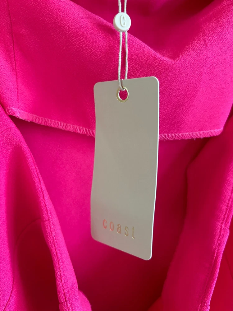 Brand new Coast bright pink cross back mini dress Size 10 Still with tag Length (from underarm to hem) - approx 23" Criss-cross straps at back Opening at back 95% polyester, 5% elastane Zip down back