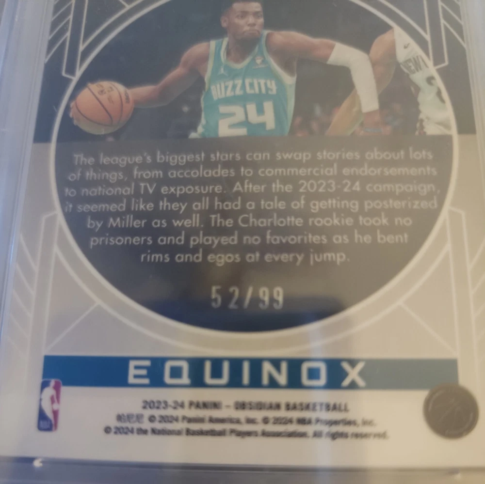 This rare and highly sought-after 2023 Panini Obsidian Equinox RC /99 trading card features the talented basketball player Brandon Miller, making it a must-have for any sports card collector. The card has been professionally graded by the distinguished Professional Sports Authenticator (PSA) and has received a Grade 9, ensuring its authenticity and quality. This sports trading card is an excellent addition to any collection, showcasing Miller's rookie status and his promising future in the sport. The card's features include a beautiful design, excellent quality, and a unique serial number, making it a valuable and rare find. Don't miss out on the opportunity to own this exceptional trading card!