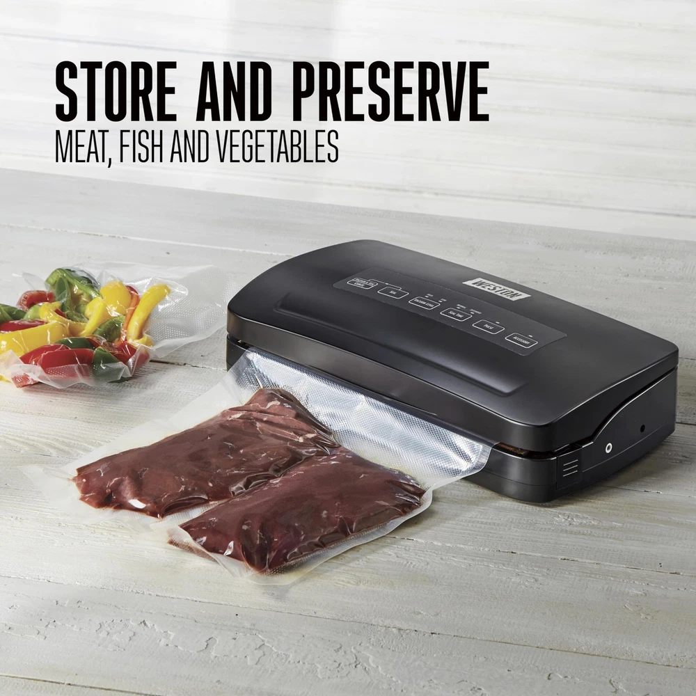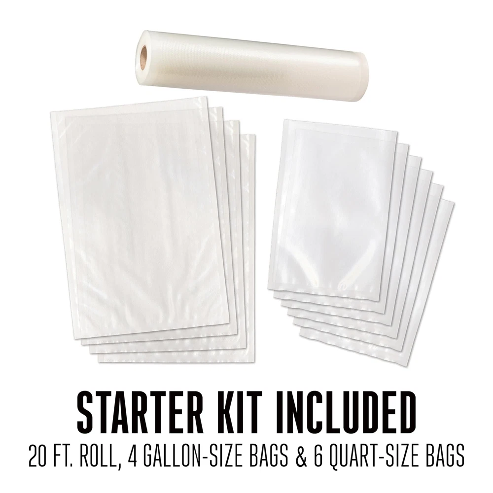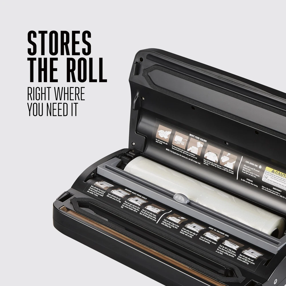 The ® Vacuum Sealer with Roll Storage and Bag Cutter makes it fast and convenient to seal and preserve meat, fish, game and more. The vacuum sealer has 5 versatile settings and includes an 11" x 20' vacuum seal roll, 4 gallon and 6 quart bags. STORE & PRESERVE A VARIETY OF FOODS: The vacuum sealer machine is great for preserving meat, fish game, produce, foods bought in bulk, leftovers and more. Vacuum sealing is also useful for storing valuables and other items for travel and emergencies. 5 VERSATILE SETTINGS: Digital controls let you vacuum and seal bags simultaneously or seal only, and has high and low vacuum level settings, and normal and extended seal time options. Use the pulse button to seal delicate items like pretzels or cookies. KEEP FOODS FRESH UP TO 5X LONGER: Vacuum sealing and storing foods in vacuum sealer bags help keep foods fresh up to 5x longer. Reduce food waste and save up to $2,391 per year.* STORES THE ROLL RIGHT WHERE YOU NEED IT: Roll storage is integrated into the food vacuum sealer machine, so you always have a roll on hand when you need to make a bag. The lid locks in place to keep vacuum seal rolls clean. QUICKLY CREATE CUSTOM-SIZED BAGS: The integrated roll storage has a sharp built-in bag cutter for precise cuts when making custom-sized bags. Easily cut bags to your desired length. *NRDC ("Wasted" 2017), adjusted for inflation