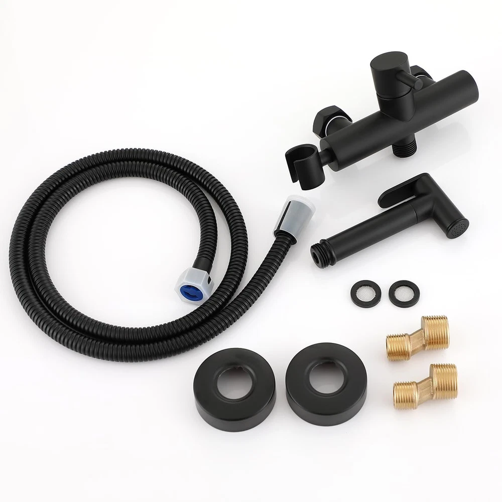 Brass Toilet Sprayer Kit Hand Held Bidet Sprayer for Toilet Hot and Cold Water Diaper Sprayer Shattaf Bathroom Attachment Specification 1.Material: Brass sprayer head and bidet faucet, Stainless Steel hose 2.Finish: Matte Black 3.Standard size: Male G1/2" Package 1X Brass bidet sprayer 1X Brass hot and cold mixing tap 1X1.2M stainless steel hose. Why choose to buy? Everything you need is in the box. Our Hand Held Bidet that includes a Brass Pressure Bidet Sprayer Head and Brass hot and cold water bidet faucet. High Quality Bidet Set to conveniently attach your Bidet Sprayer to your toilet. Four quality components tried and tested to bring added comfort to your bathroom as well as luxury to your bathroom hardware appeal. The Full Set is made of high quality Brass Material and Smooth Matte Black Finish and have a nice look. Matte Black Finish: Wall Mounted Toilet Hot and Cold Bidet Sprayer Set Concealed Bidet Spray Set: Toilet bidet sprayer set with hot and cold mixing valve, in wall mounted, space saving and integrated design Standard 1/2" Male Connector: Bidet shower tap water pipe thread is standard 1/2" connector, suit for most water lines and easy to install Hand held Sprayer Bidet Set with Hot and Cold Water: Perfect solution for daily personal hygiene, and even can be used for shattaf, muslim shower, baby cloth diaper sprayer set in toilet, dog shower and so on 47 inches anti-leaking 304 stainless steel bidet spray hose could withstand 250 PSI water pressure, you do not need worry about if you forget shut off the valve, offer you a comfortable and safe bathroom environment.