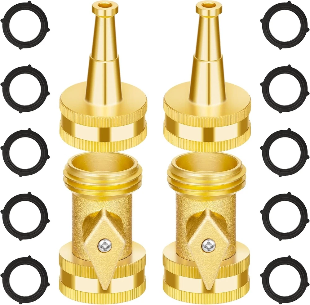 Brass Hose Nozzle - High Pressure Jet Nozzle 4 Count (2 Set), Heavy Duty Wate HEAVY-DUTY & PREMIUM BRASS MATERIAL: Our set includes 2pcs brass hose shut off valve with brass handles & 2pcs brass hose jet nozzles. The solid brass material ensures durability and longevity, while the rugged design allows it to withstand accidental drops and bumps. Extremely durable and resistant to rust. You can use it for extended periods without worrying about wear and tear, and it can withstand high water pressure without cracking or leaking. HIGH PRESSURE HOSE JET NOZZLE: Featuring powerful jet stream and strong water flow, meeting your needs from high pressure washing your cars, cleaning deck, floor, window, driveways, sidewalks to garden watering and dog washing. Delivering a strong and consistent water flow, making it ideal for cleaning hard surfaces, you can trust this nozzle to provide reliable performance, making it an ideal tool for all your watering and cleaning needs. LEAK PROOF DESIGN & 3/4" HOSE THREAD: Our brass garden hose jet sweeper sprayer nozzle with brass hose shut off valve set features a smart design that provides excellent leak-proof performance. Hose shut off valve with brass handle for easy turn on or turn off the flow, 3/4" GHT thread can easily and quickly connect / disconnect all USA standard garden hoses, allowing for easy installation and use.