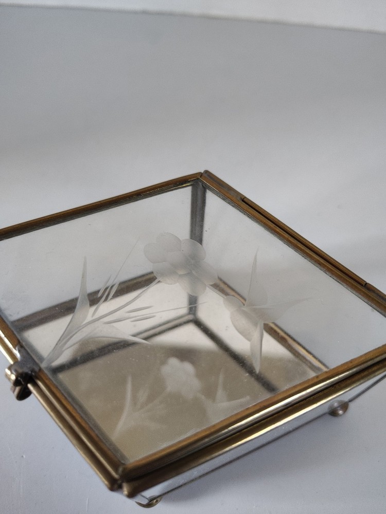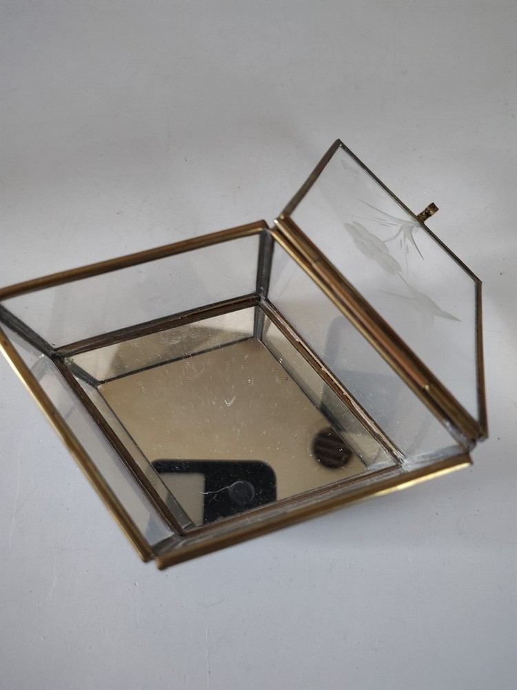 This trinket box features a unique design with a mirrored bottom showcasing an etched hummingbird and flower pattern. Made of brass and glass, the diamond-shaped box is small in size, making it perfect for all occasions. The press fastening closure ensures your trinkets are secure, while adding a touch of elegance to any room decor. Ideal for collectors or anyone looking to add a decorative piece to their home.