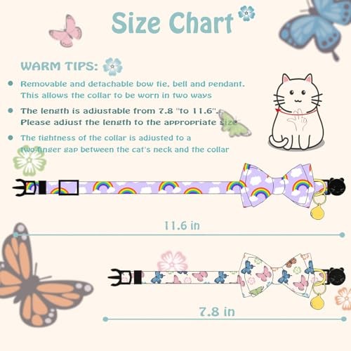 Return Policy Fast Delivery Trusted seller Breakaway Cat Collar with Cute Bow Tie Bell 2Pack Rainbow Butterfly Pattern for Male Female Soft Cotton Kitty Kitten Collar Cute Summer Collars Ideal for Girl Cats Boy Male Cats Product Description Cotton cat collar made of high quality soft material and textile hand-sewn, soft without being flimsy,feel comfortable, strong toughness, light weight, durable,skin-friendly. Blending a lightweight design with supreme comfort, ensuring your catty companion experiences pure ease without any added burden- the perfect gift for your beloved cat. These cute & lightweight cat collars are available in a variety of vibrant colors and rich pattern elements. This cat collars come with adorable pendants that add irresistible allure to your beloved pet. Meet your different decorative needs for your beloved pet. Keep your cat captivating at all times. Cute Cat Collar adjustable from 7-11" inch ,Cute and handsome while making cats feel light and comfortable, almost forgetting the existence of the collar.High attention to pet details, representing the "PREHAI pet comfort quality first" concept. perfect for little kitten or adult cat. Breakaway (i.e. "safety / quick release") buckles design,The safe buckle releases when pressure is applied. Simply give it a tug, and it swiftly releases,provides more safety for your cat.And the bell ringing can make you notice. Removable bowtie. Comes with easy to put on and take off bow tie accessory. Bow tie is easy to put on / remove with elastic loop for easy wear.This allows the collar to be worn in two ways. Shipping Returns Payment Shipping Shipping is FREE to all addresses other than APO/PO boxes in the lower 48 states. All our stock ships from US-based warehouses. Shipped via USPS or UPS (depending on location and package weight) Unless stated otherwise, all orders will ship within 24-72 hours of your payment being processed. Check our feedback to see the great reviews of FAST shipping we offer. Returns Seller does not accept returns Payment We currently accept payment via eBay managed payments only. Once payment is cleared, we will dispatch your shipment within 1-3 business days. Please refer to the "Shipping" tab for more information regarding shipping speed to your destination.