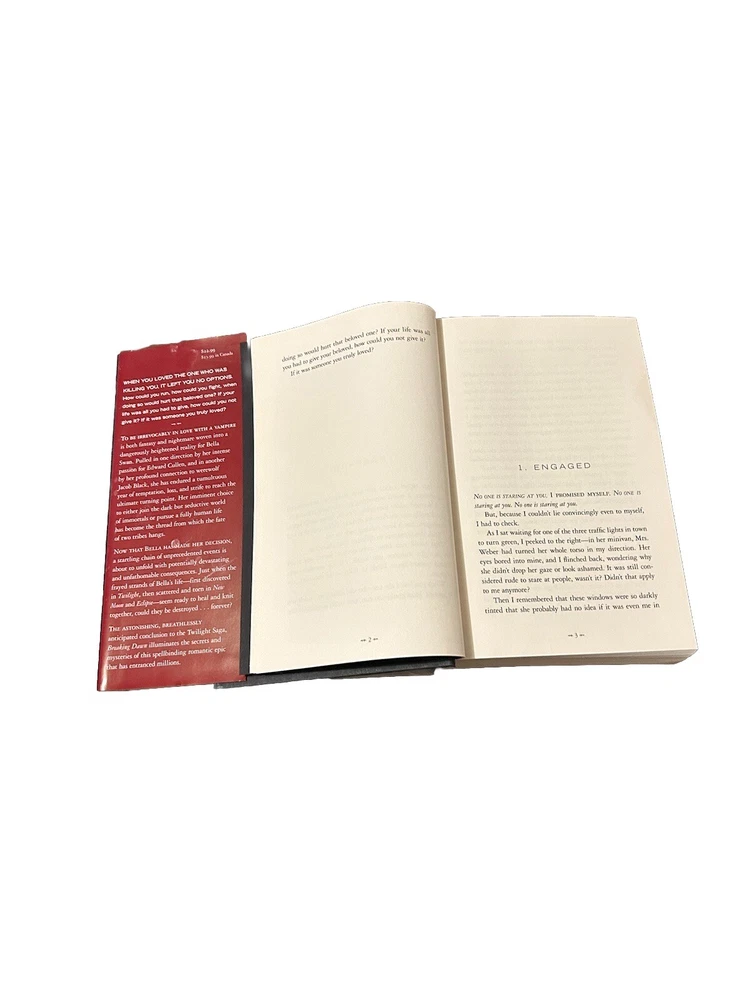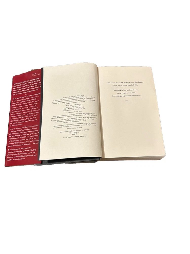 Item Width: 6 in Narrative Type: Fiction Language: English Country/Region of Manufacture: United States Book Title: Breaking Dawn Publisher: Little, Brown Books for Young Readers Original Language: English Author: Stephenie Meyer Type: Novel Genre: Young Adult Fiction, Juvenile Fiction Topic: Romance / Paranormal, Paranormal, Occult & Supernatural, Family / Marriage & Divorce, Social Themes / Dating & Sex, Vampires, General, People & Places / United States / General Number of Pages: 768 Pages Signed: No Intended Audience: Young Adults, Adults Format: Hardcover Publication Year: 2008 Features: Dust Jacket Edition: First Edition Book Series: The Twilight Saga Ser. Item Length: 8.6 in Item Weight: 29.7 Oz Vintage: No Item Height: 2.5 in