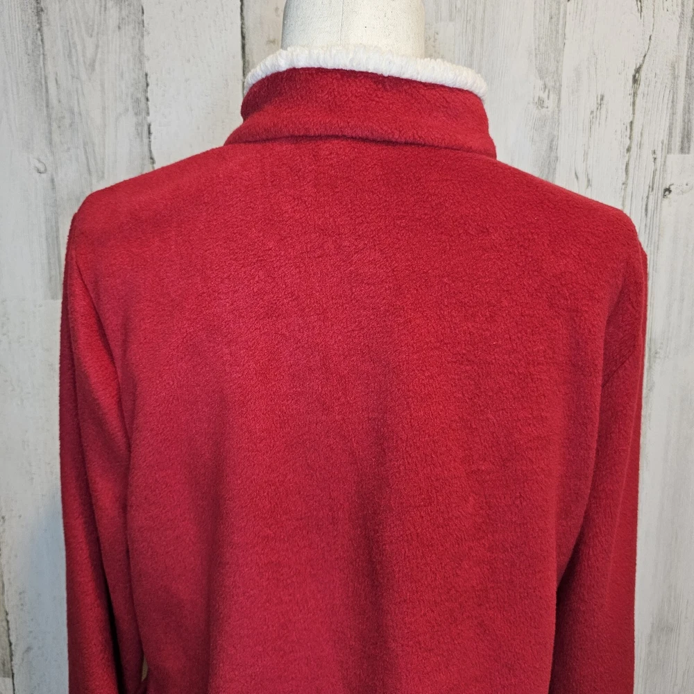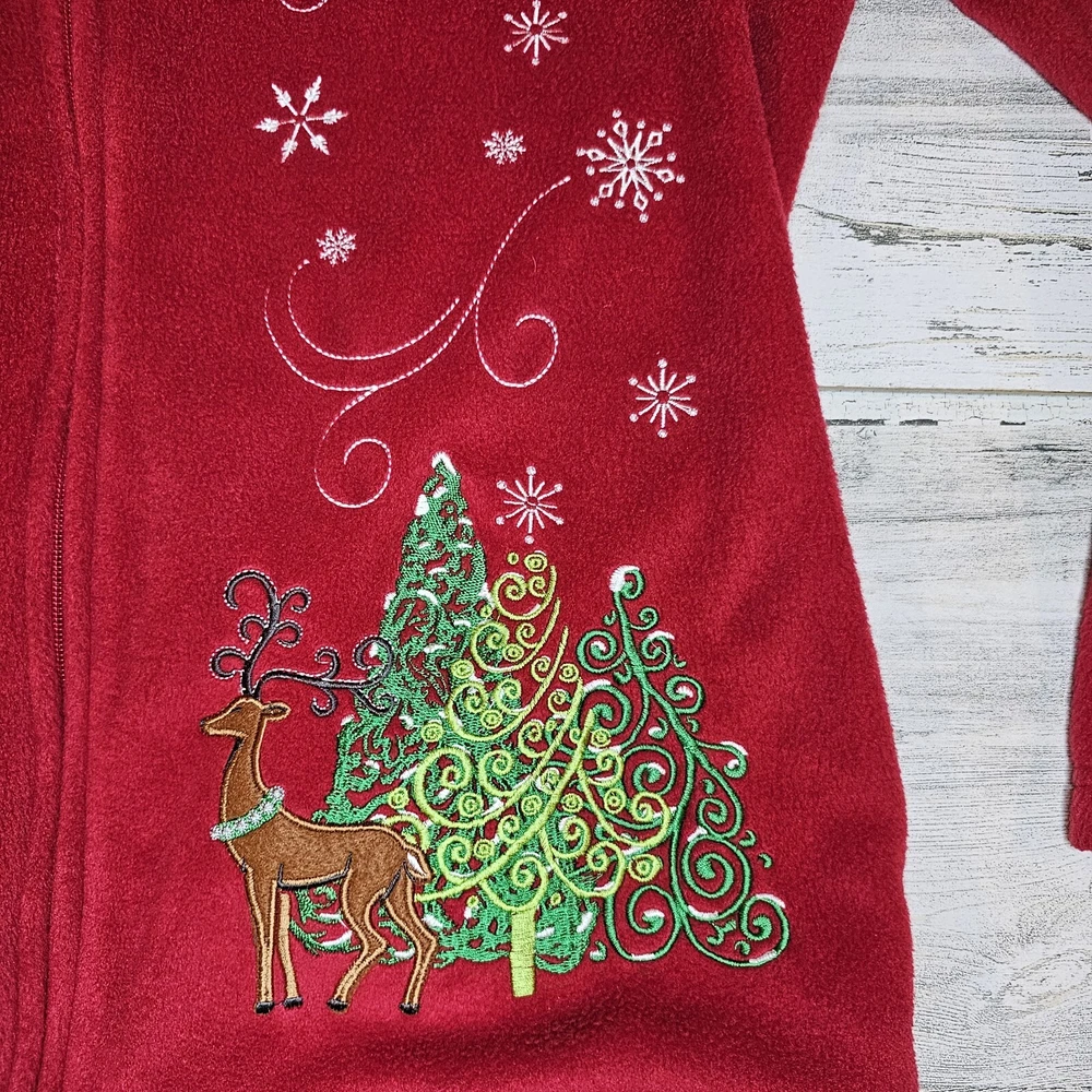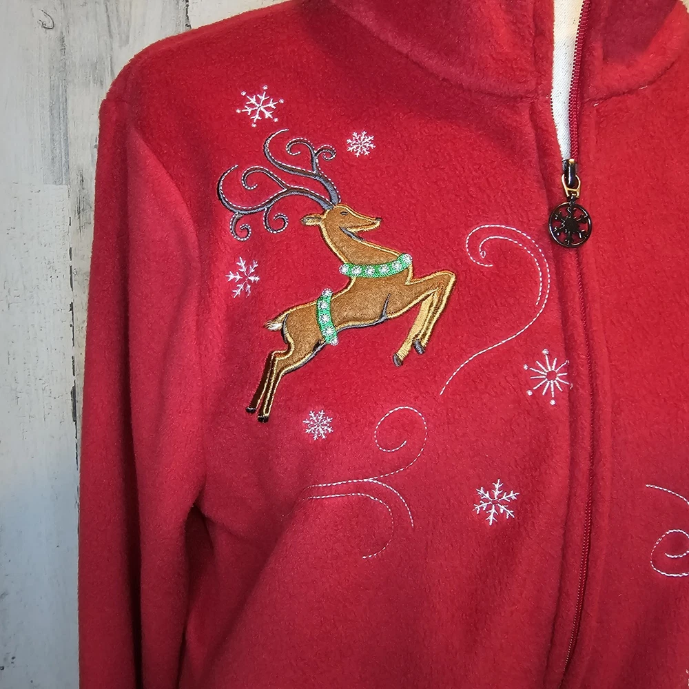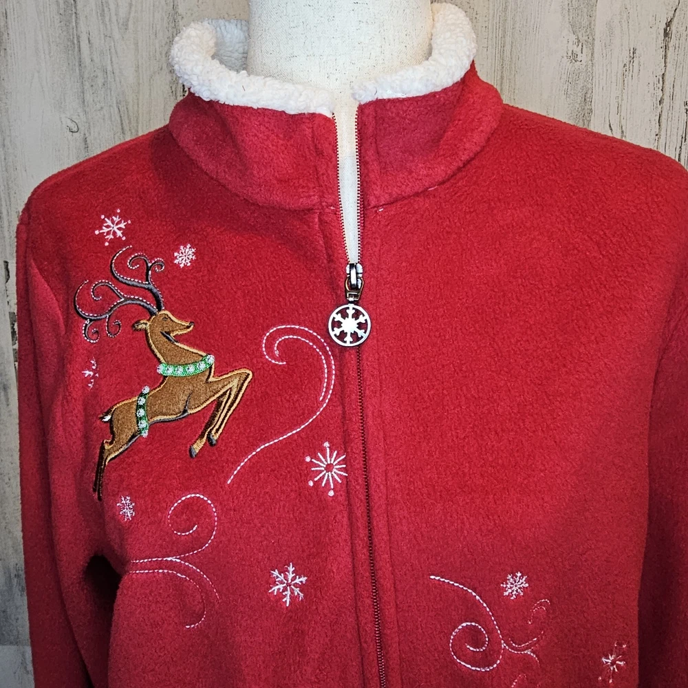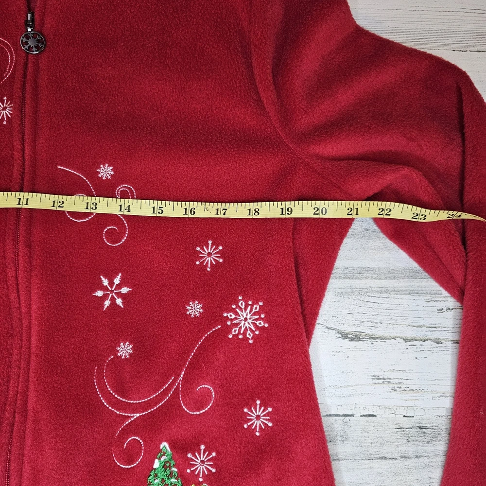 Celebrate the holiday season in style with this festive Breckenridge red fleece jacket. Designed for warmth and charm, it features a cozy sherpa-lined collar and intricate embroidered details, including a prancing reindeer, Christmas trees, and snowflakes. Perfect for holiday gatherings or casual winter outings. Brand: Breckenridge Size: Large (Women's) Material: 100% Polyester Color: Red Features: Sherpa-lined collar for added warmth Full-zip front with decorative pull charm Embroidered reindeer, Christmas trees, and swirling snowflakes Side pockets Measurements: Bust (pit to pit): Approx. 21 inches Length (shoulder to hem): Approx. 26 inches Condition: Pre-owned, gently worn, in excellent condition with no noticeable flaws. #BreckenridgeJacket #ChristmasJacket #RedFleeceJacket #SherpaCollar #HolidayFashion #ReindeerEmbroideredJacket #ChristmasGiftIdea #WinterWardrobe #WomenLarge