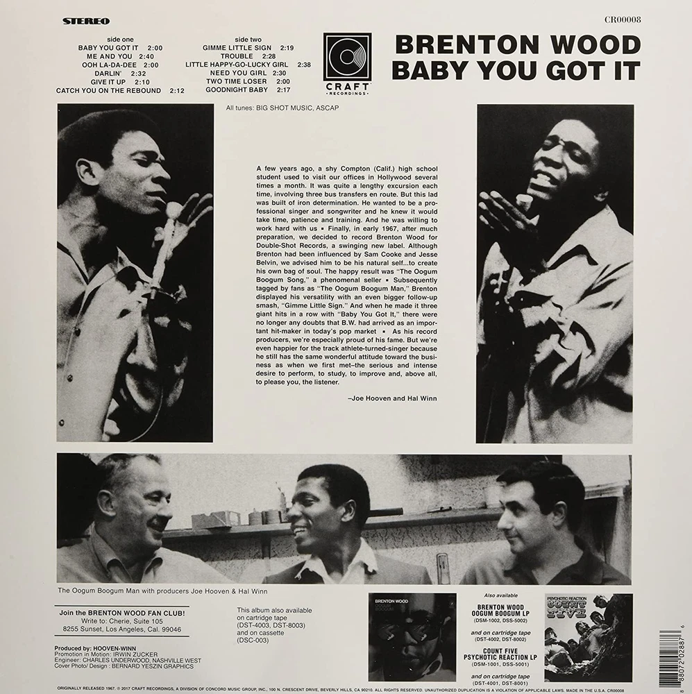 Further Details Title: Baby You Got It Condition: New Description: EDITORIAL REVIEWS Brenton Wood's classic second album Baby You Got It features the smash hit, "Gimme Little Sign" as well as his signature ballads "Me & You" and "Catch You On The Rebound". Officially back in print on vinyl for the first time since its original release in 1967. Format: Vinyl Genre: R&B Artist: Brenton Wood No Of Discs: 1 Record Label: Craft Recordings EAN: 0888072028876 Type: Alle afdelingen MPN: 888072028876 Missing Information? Please contact us if any details are missing and where possible we will add the information to our listing.