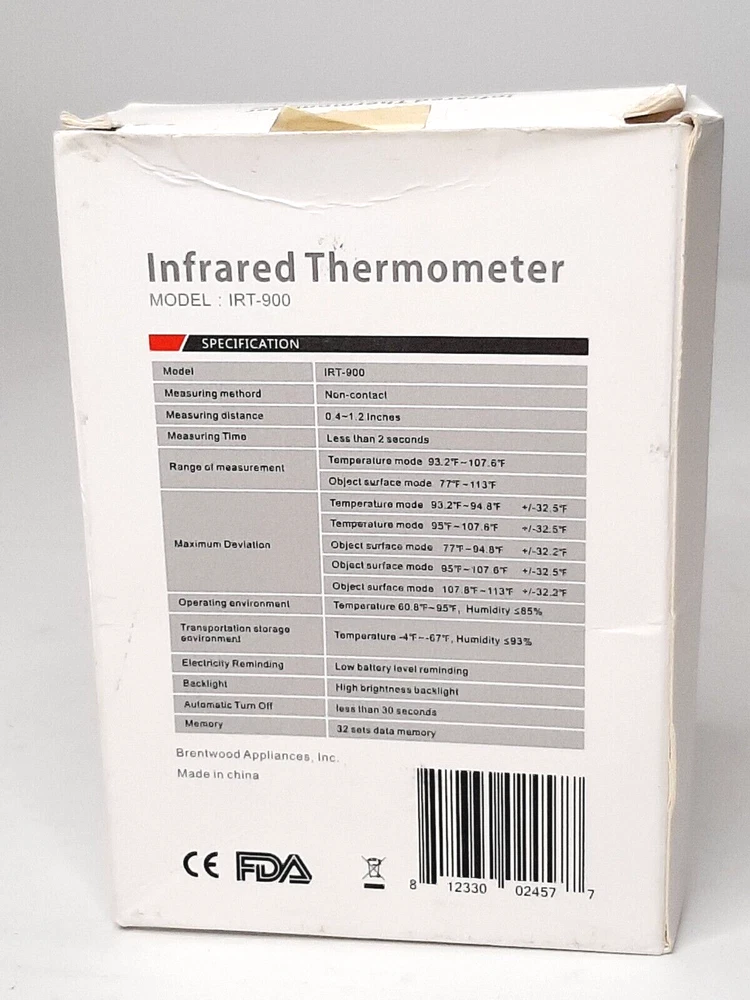 Brentwood Infrared Thermometer No-Touch Temporal/Forehead Model IRT-900 Good condition; minor signs of use and wear; battery door is a little touchy