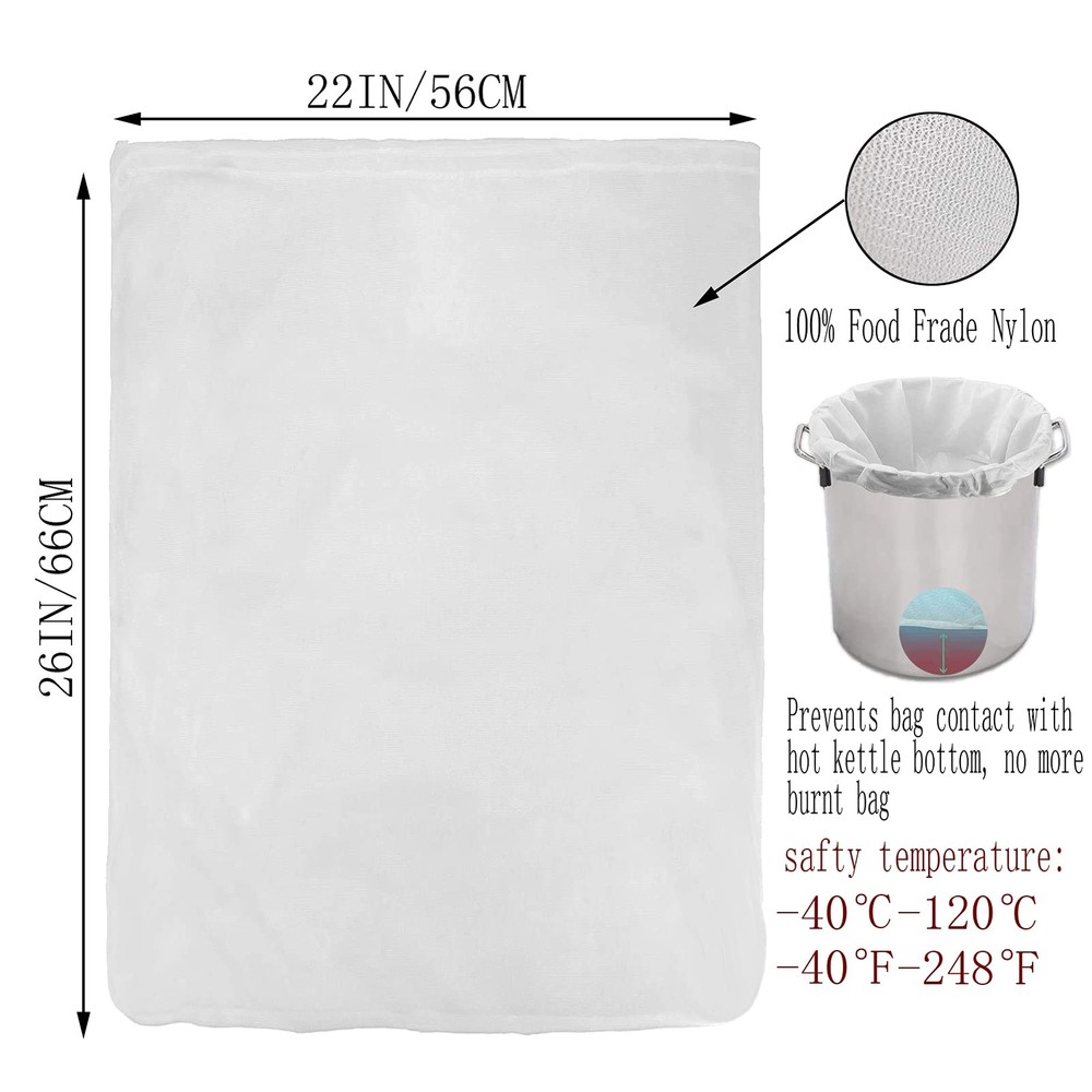 Nylon Material:Made of nylon cheese cloth, The straining bag is an easy and economical choice for home brewers to start all-grain brewing according to the Brew in a Bag-method. High-quality nut milk bag helps us to get perfect results to live a health life.This product is a useful tool for home brewing and various drink DIY. Perfect Design&Large Size:You get 2 pack 26"X22" high quality mesh strainers,It meet almost home and commercial use,It is with a wider opening,fast drying and cotton Drawstring Drawstring.You can squeeze it with both hands and start making the most nutritious, creamy and silky smooth nut milks!The large size makes our brew bag versatile enough, from jams to cold brew to cider and fruit wine making ect. Wide Range of Application:Perfect for Nut Milks,Cheese Making,Yogurt, Juices,Wine Making, Fruit Brewing.With a drawstring closure.The drawstring is strong and helpful to keep the bag tightly, ensuring a complete seal before the removal of raw material. Easy to Wash, Durable and Reusable:It's easier to squeeze for faster results.The perfect micron mesh is easy to clean, only wash with warm soap water, rinse and let them dry.The bag is hemmed to make it stronger,It'll last longer. Quality Service: If you have any questions please contact us, We will do it takes with outstanding customer service. Please be assured the purchase.