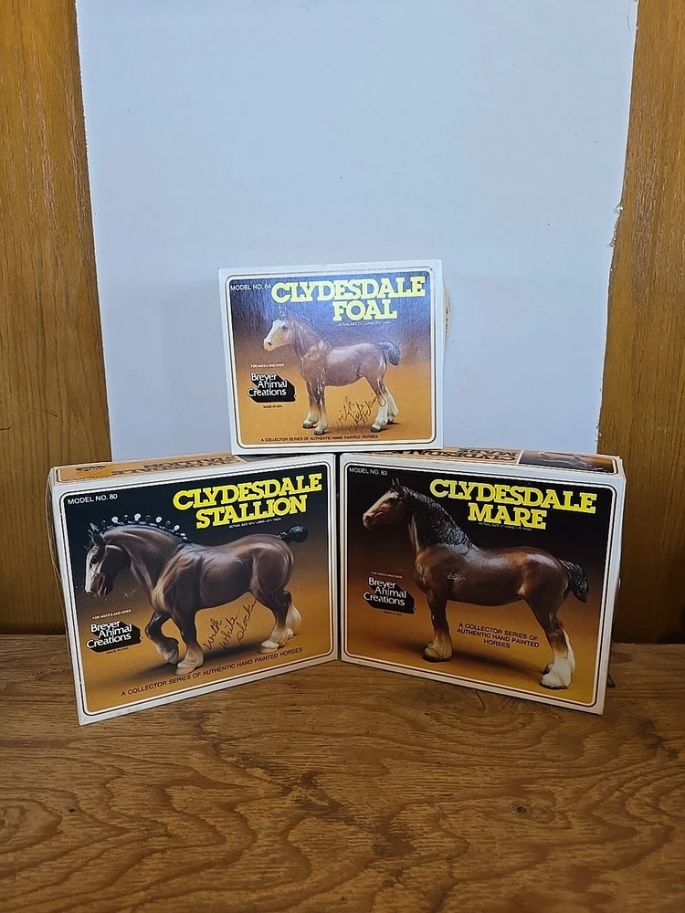 Breyer 1982 Clydesdale Stallion #80, Mare #83, and Foal #84. This stunning model horse collection is made of high-quality plastic and comes with its original boxes.