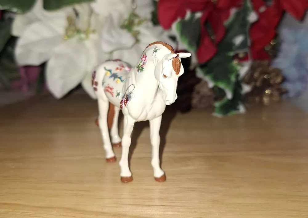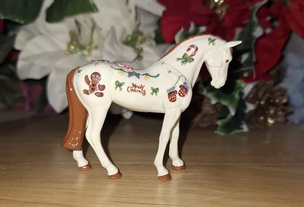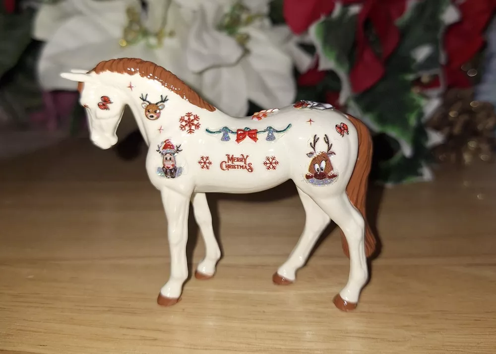This Custom Breyer Christmas Stablemate is a must-have for any horse lover. With its off-white coat, chestnut mane and tail, and Reindeer design, this horse is sure to catch your heart. It's the perfect addition for any collector or as a decorative piece. This horse is hand painted and decorated by myself to celebrate the fun of the Holidays. He is painted in acrylic paints and sealed in several layers of high gloss sealer. The size of the horses are 4 x 3 inches, making it a perfect addition to any collection. This Breyer Stablemate is a great gift for anyone who loves horses or is a collector looking to add a unique pieces to their collection. This piece is sold as is for decoration and not live show quality.