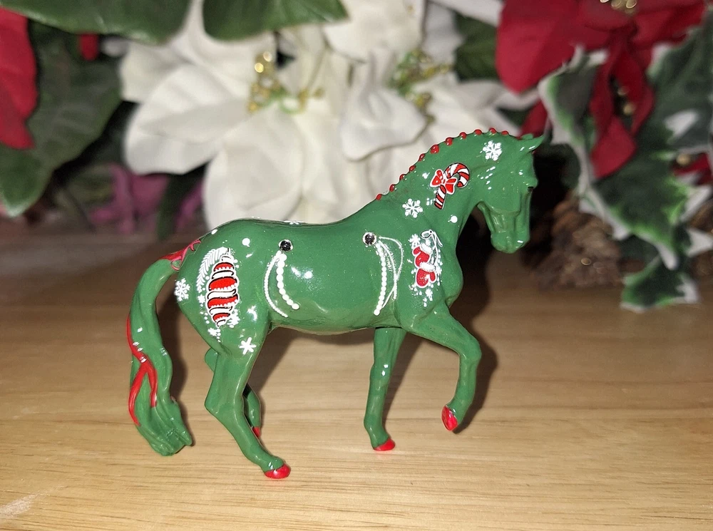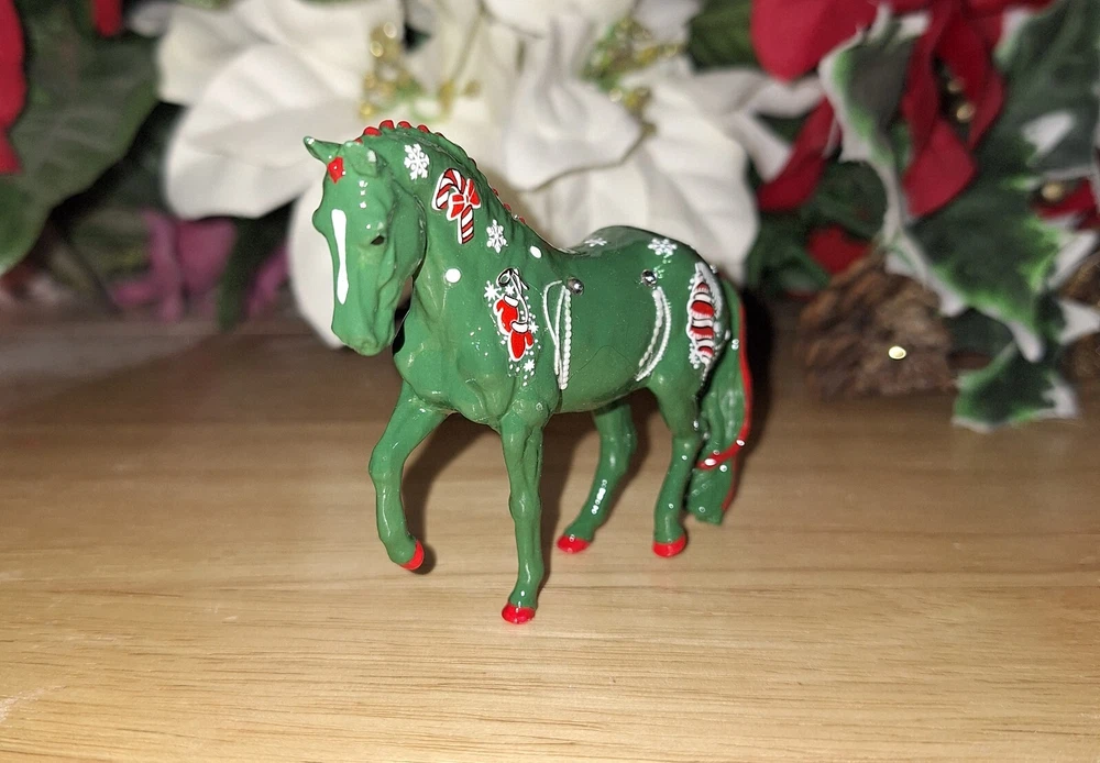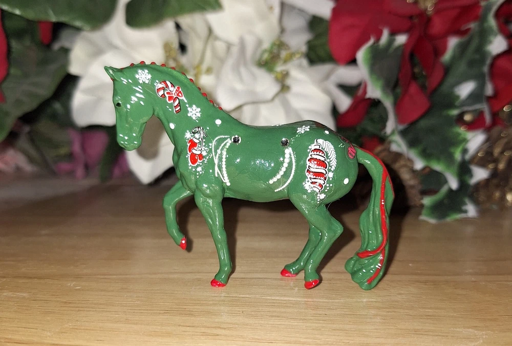 This Custom Breyer Christmas Stablemate is a must-have for any horse lover. With its colorful green coat and red and white Christmas design, this horse is sure to catch your heart. It's the perfect addition for any collector or as a decorative piece. This horse is hand painted and decorated by myself to celebrate the beauty of winter. He is painted in acrylic paints and sealed in several layers of high gloss sealer. The size of the horses are 4 x 3 inches, making it a perfect addition to any collection. This Breyer Stablemate is a great gift for anyone who loves horses or is a collector looking to add a unique pieces to their collection. This piece is sold as is for decoration and not live show quality.
