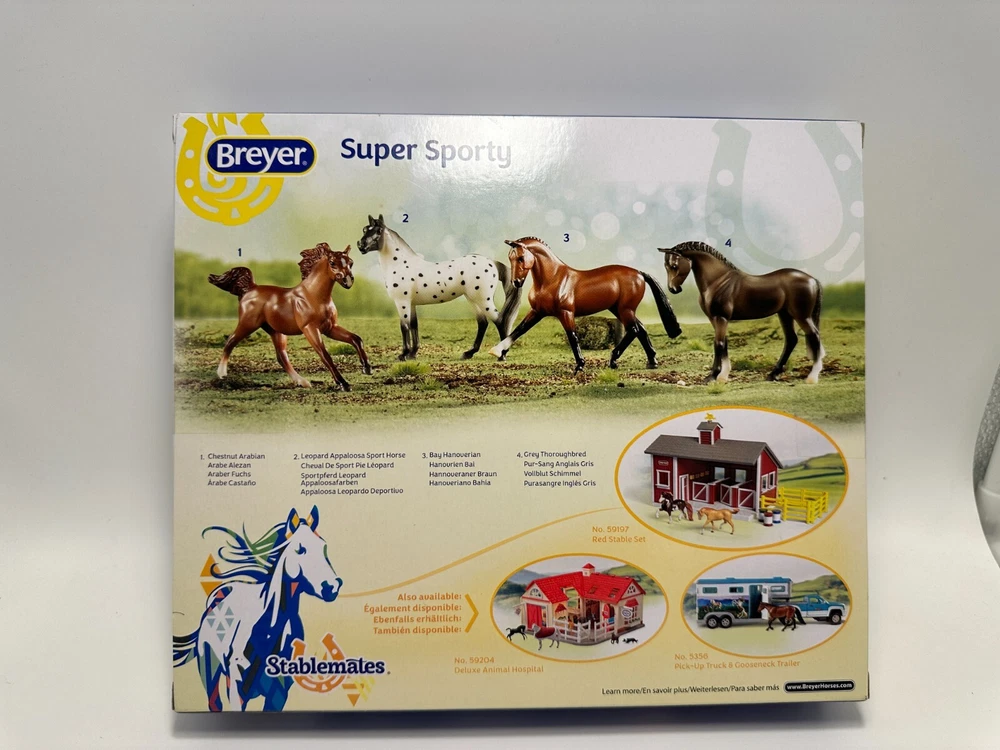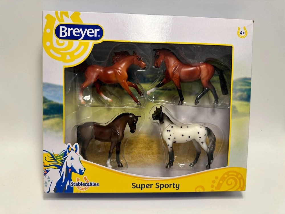 This Breyer Stablemates Super Sporty 4 Horse Set in 1:32 Scale is a must-have for any horse lover. The set includes four beautifully crafted plastic horses, each with intricate details that make them unique. The horses are designed for collectors and enthusiasts alike, and are perfect for display or play. With a brand like Breyer, you can trust that these horses are of the highest quality. Made in China, this set is a great addition to any collection and is sure to impress. Whether you're a seasoned collector or just starting out, this Breyer Stablemates Super Sporty 4 Horse Set is a great investment.