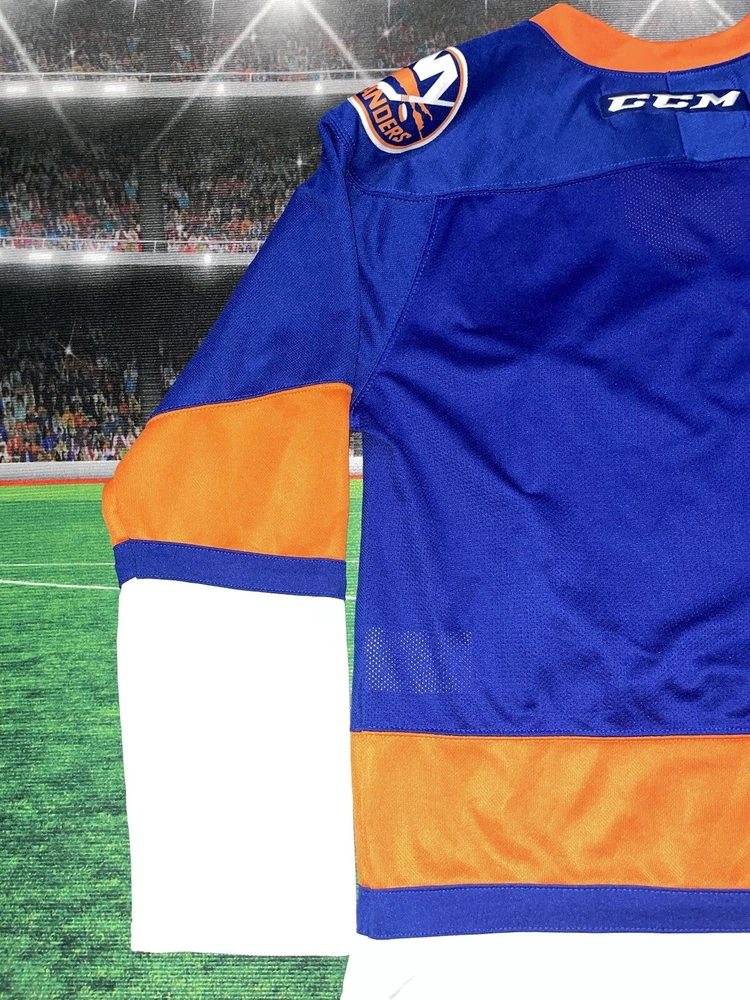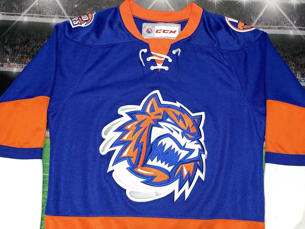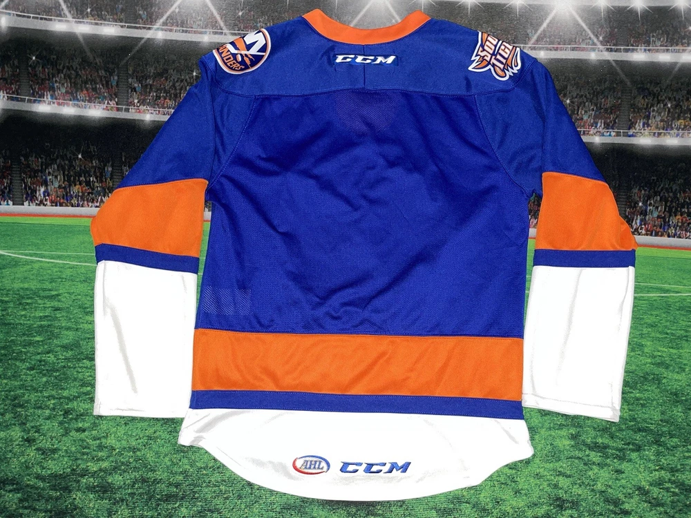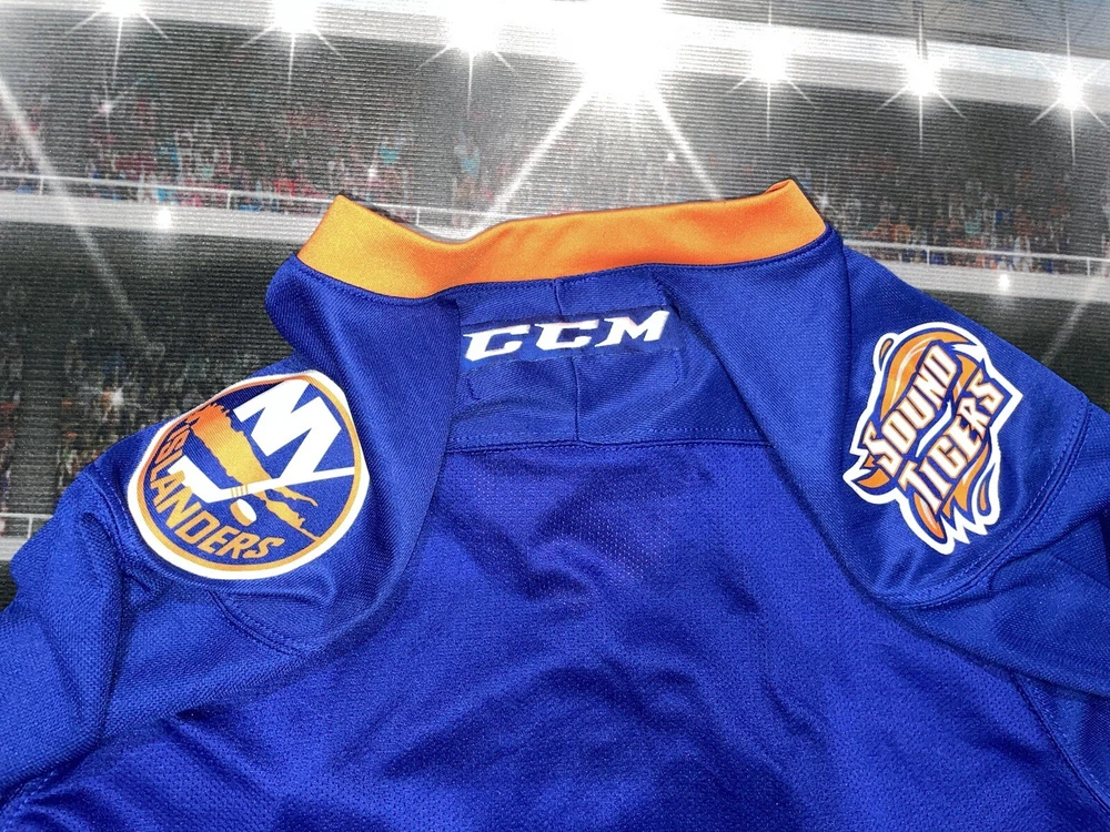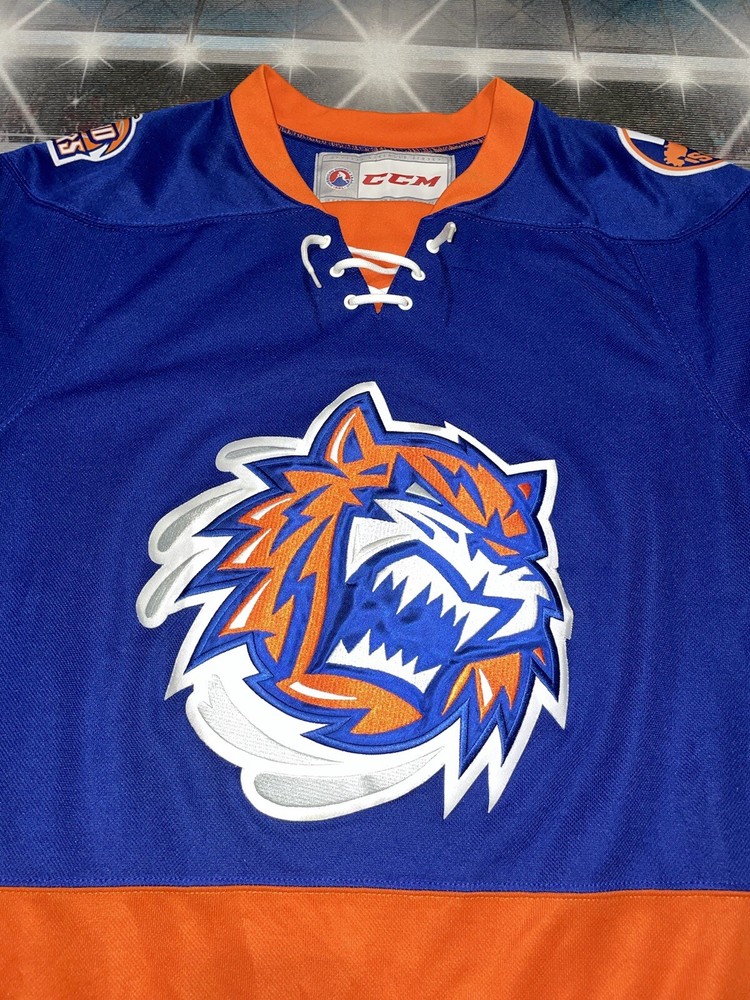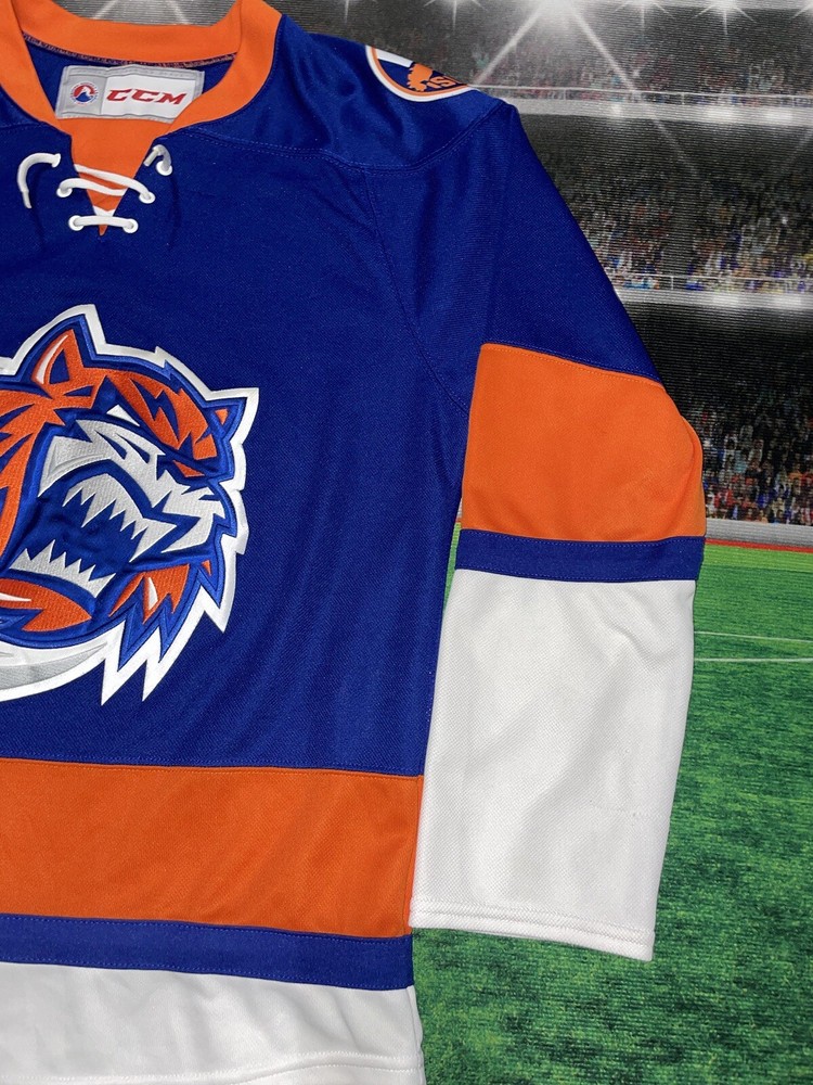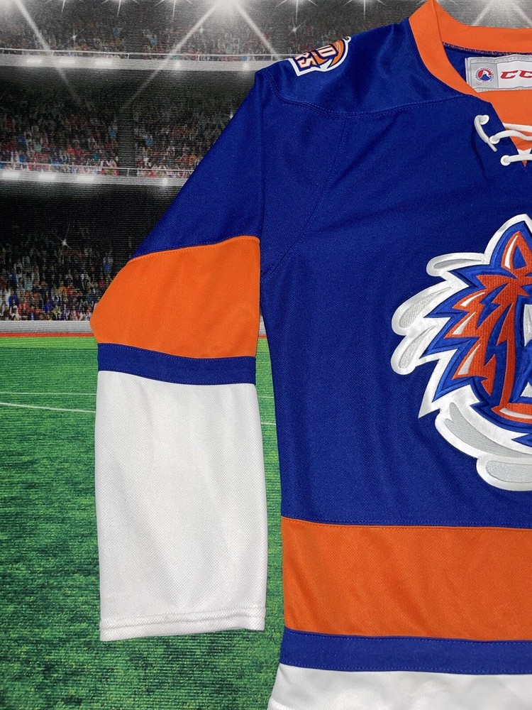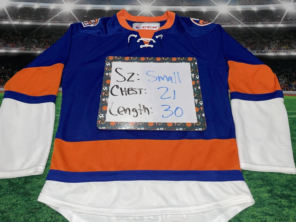 Item is nice little spot on the sleeve smoke free Show your support for the New York Islanders with this Bridgeport Sound Tigers AHL hockey jersey. Made by CCM, this jersey is perfect for any fan of the National Hockey League (NHL). It features the team's colors of blue and the iconic Sound Tigers logo on the front. This jersey is a size small and made for men. It is perfect for any fan of the Islanders looking to show their support for the team. Whether you're heading to a game or just want to add to your collection of fan apparel, this jersey is a great choice.