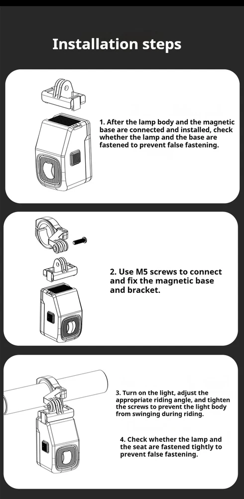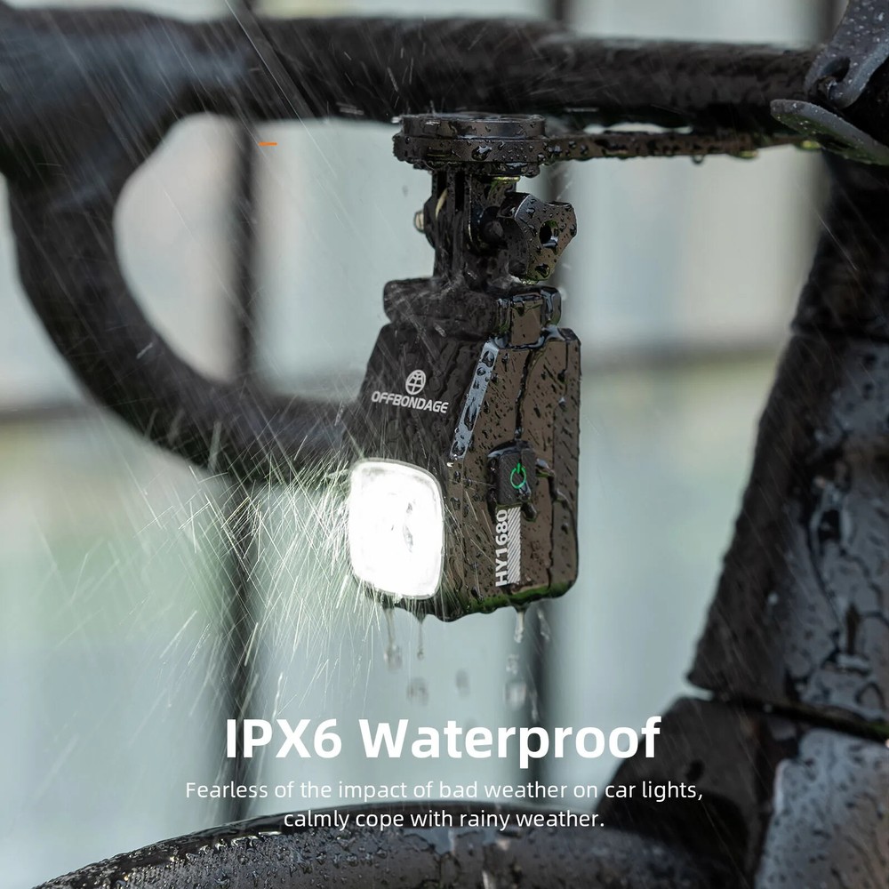 Suspended Inline Bike Light - One-piece High/Low Beam, Friendly Riding 1600 Lumens | Wireless Remote | High/Low Beam Adjustment Multi-Function Design 1600 Lumens Brightness | Wireless Control | Front Hoisting | High/Low Beam Adjustment | IPX6 Waterproof | TYPE-C Charging Product Information Brand: OFFBONDAGE Name: Bicycle Light Material: AL+PC Waterproof: IP65 Weight: Approx. 175g Functions: Low/Medium/High/Breathing/Quick Flash Battery Life: 2.5-12 hours Illumination Distance: 220 meters Charging Time: Approx. 3 hours Charging Current: 18W PD fast charging support Mounting Method: GoPro magnetic Battery Capacity: 5000mAh 1600 Lumens - Compact and Bright Using efficient LED light sources, this light adapts to all kinds of night riding. Battery Life Battery life for different brightness levels: Low: 12 hours Medium: 6 hours High: 3 hours High Beam: 2 hours 50 minutes Flashing: 6 hours Breathing: 4 hours Wireless Remote Control for Convenient Operation Equipped with a wireless remote, easily switch between high/low beams and modes without taking your hands off the handlebars, enhancing riding safety. Lock Function to Prevent Accidental Touches Hold the button for three seconds to lock/unlock the light, preventing accidental operations. Smart Mode Switching with Vibration Sensor The light automatically turns off after 20 seconds of inactivity and wakes up when vibration is detected. High/Low Beam Switching for a Wider View Easily switch between high and low beams, making night riding smoother and ensuring a safe field of vision. IPX6 Waterproof - Ready for Any Weather! No need to worry about rain or bad weather (but avoid long-term immersion). TYPE-C Charging, 5000mAh Large Capacity Battery Red indicator breathes when charging, turns green when fully charged. (100% green light, 30% red light, 5%-0% power - auto shutdown). Quick Release Design - No Tools Needed! One-click unlock, easy installation and removal, making your ride more convenient. 18W Fast Charging - Ride Without Worry! Say goodbye to long charging times, improve efficiency, and enjoy uninterrupted riding. Installation Steps: Connect the lamp body with the magnetic base and ensure they are securely fastened to prevent loose connections. Fix the magnetic base and the bracket with the M5 screw. Turn on the light, adjust the proper riding angle, and then tighten the screws to prevent the light from shaking during the ride. Check again to ensure the lamp is securely fastened to the base. ️ Sturdy Installation, Adaptable to All Terrains! Whether on city streets or country roads, this light stays firmly in place, accompanying you on every ride. The Perfect Companion for Outdoor Cycling Day or night, this bike light is your reliable partner for safe cycling!