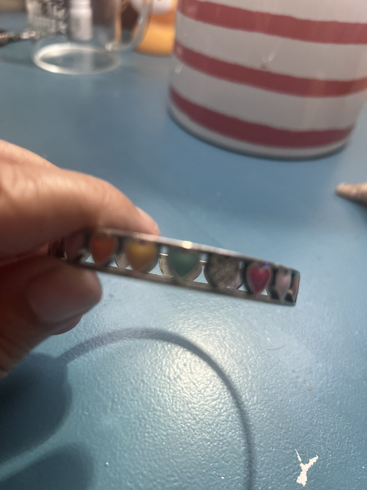 This Brighton Bon Bon Hearts Bangle Bracelet is a rare and retired piece perfect for Valentine's Day. The bracelet features a colorful enamel designcreating a lovely and festive look. With a bangle style and silver plated metal, this bracelet is designed for females and is a statement piece that exudes elegance and charm. Perfect for adding a pop of color and sparkle to any outfit, this Brighton bracelet is a must-have for any jewelry collection.