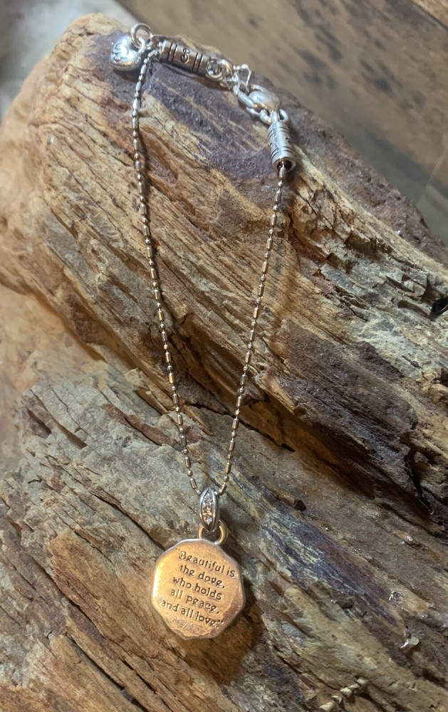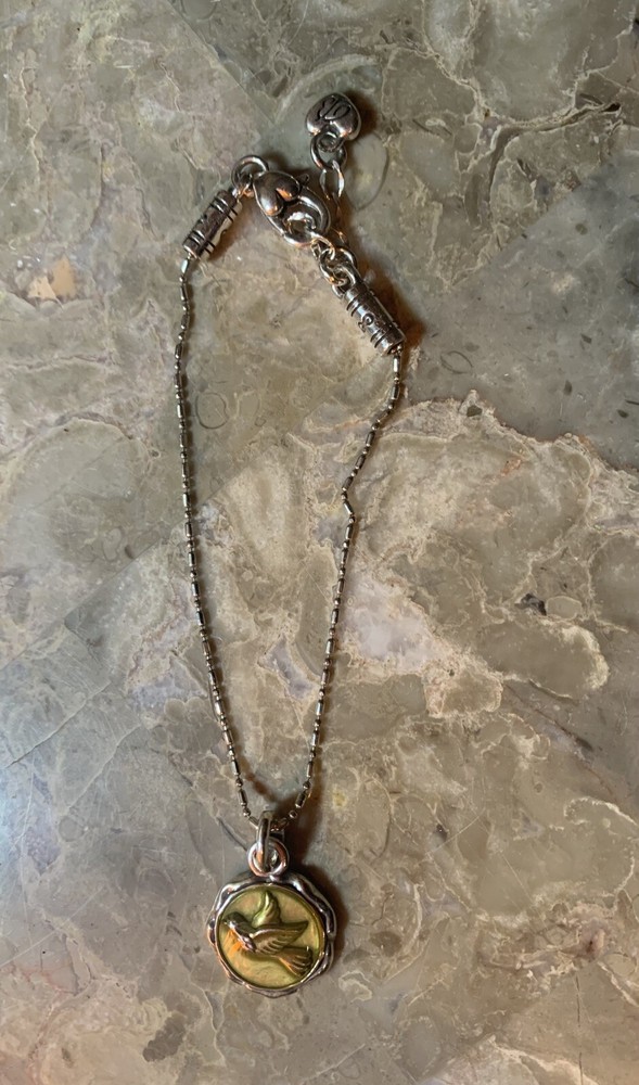 The Brighton Dove Charm Bracelet with Crystals is a beautifully crafted piece of jewelry that exudes peace and love. Silver plated and adorned with white/colorless crystals, this bracelet features a charming dove charm that adds a touch of elegance. The adjustable lobster closure makes it a versatile accessory suitable for various occasions such as Mother's Day, engagement, Christmas, wedding, anniversary, birthday, and Valentine's Day. The Brighton brand ensures quality and the piece is signed, giving it a touch of authenticity. Ideal for those who appreciate charm bracelets and love-themed accessories.