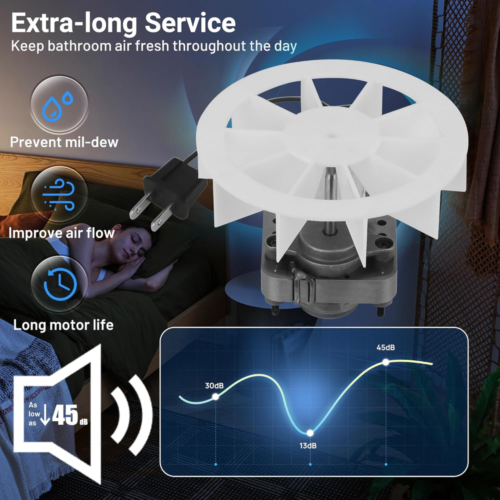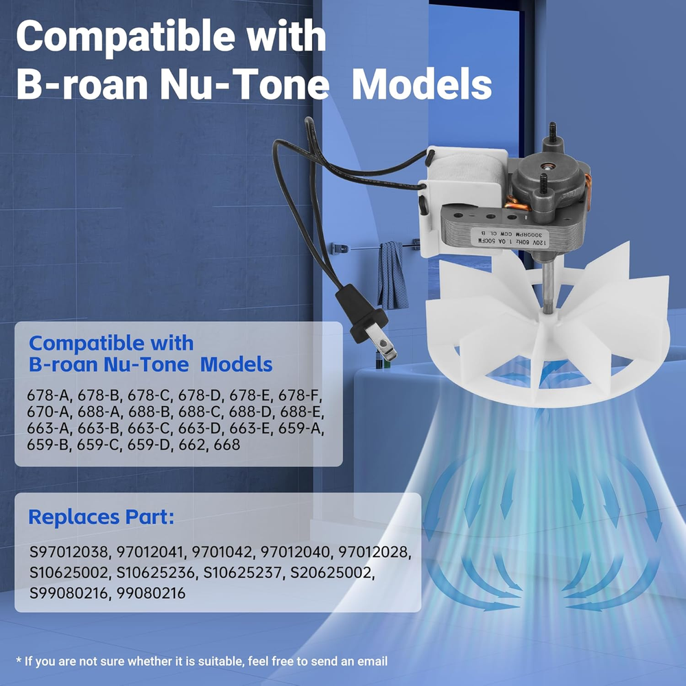 BP27 S97012038 Bathroom Vent Exhaust Fan Motor and Wheel for Broan Nutone 0.29A High-Quality: 97012038 Bathroom exhaust fan motor (with plug), 120V, 60Hz, 0.29A, 3000 Rpm, 50 CFM, CCW, CL B, this bathroom fan motor 97012038 is designed, tested, and certified to ensure your product runs at peak performance Replaces Part: Compatible with Broan NuTone 659, 662, 663A, 663B, 663C, 663D, 663D, 663E, 668, 678, 678B, 688, 688A, 688B, 688C, 688D, 688E Compatible Models: Our bathroom fan motor S97012038 replaces 1172611, 97008511, 97008512, 97012038, 97012040, 99080090, 99080093, 99080141, 99080165, 99080207, 99080216, 99080229, 99080230, 99080404, 99080406, S97008511, S97008512, S99080090, S99080093, S99080165, S99080216, S99080230, S99080406 and AP5611025 Specification: PANDEELS Bathroom fan motor BP27 S97012038 dimensions is 4" x 3" x 2.5". Wheel Measures 4-5/8" diameter x 1-1/8" high, wire with 2 plugs. 120 VAC; Sound Level: 2 Sones; Shaft Type: Splined, Shaft Diameter: 3/16", Shaft Length: 1-3/4"; Impeller OD: 4-5/8"; Rotation: CCW; Amps: 0.29A; RPM: 3000RPM; CFM: 50 CFM Easy To Install: When your bathroom fan motor becomes noisy or fails to start, simply remove the mounting bracket from its original location and replace the SM2038 S97012038 bathroom fan motor in its original position. NOTE: Turn off the power before installing this part Strong Team Support: If you have any questions after receiving the S97012038 electric motor kit, please feel free to email us, We will reply within 12 hours and we provide 7/24 service. [Logging in your Buyer Account > Click Your Account > Your Order > Contact Seller] Product Description Item model number BP27 S97012038 Bathroom Fan Motor Country of Origin China Voltage 120 Volts (AC) Model Name BP27 S97012038 Bathroom Fan Motor Horsepower 0.03 hp Speed 3000 RPM Package Dimensions 5.24 x 4.84 x 3.9 inches; 1.23 Pounds Complimentary Shipping and Easy Returns Need to return something? Enjoy our 30-day hassle-free return policy! Take advantage of free shipping across all 48 contiguous states! Your order will be dispatched within 1-2 business days once payment is confirmed. Your Opinion Matters! Your happiness is our main goal! We welcome your feedback! If you encounter any problems, reach out to us right away, and we’ll be here to help. Explore the Extraordinary! Our collection showcases fascinating products that are sure to capture your attention. What surprises await you? Delve in and discover unique items that enrich your daily life. Don't miss the amazing things we have in store for you!