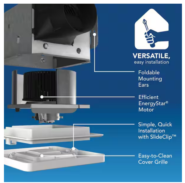 About This Product The Broan-NuTone BENL8 Roomside Series ENERGY STAR bath fan, with LED light, offers fast, easy installation without attic access and no drywall cutting necessary. The design features patent pending technology with SlideClip grille/cover making cleaning easy with a springless attachment. The grille provides a floating appearance that blends into the ceiling. This series is ENERGY STAR certified reducing energy consumption by over 50% and meeting building code requirements. All the desired features of a premium bathroom exhaust fan at an affordable price for cost-conscious, builders, contractors and DIYers. This HVI certified product has efficient performance to remove moisture, odors and pollutants to provide Better Quality of Air for Better Quality of Life Highlights Fast, Easy Install: No cut room side installation makes it possible to retrofit to spaces with no attic access, without having to cut drywall - saving time and reducing complexity SlideClip Grille: Patent pending technology for a springless attachment that allows for fast installation of the grille/cover and easy cleaning. Simple Design: Grille provides a floating appearance that blends into the ceiling ENERGY STAR Certified: Reduces energy consumption by over 50% compared to standard bath fans. Quiet Operation: Sound as quiet as a soft conversation (2 sone) with strong ventilation for rooms 60-99 sq. ft. Durable LED Light: Long-lasting, integrated LED light is rated for 50,000 hours of life at a 3500K color temperature. Light is dimmable with the compatible wall control (sold separately) EZDuct Connector provides superior airflow and creates an airtight seal from inside the housing Housing fits the most common fan size opening, 7.5" x 7.25" Innovative technology at an affordable price for cost-conscious, builders, contractors and DIYers. Click here for more information on Electronic Recycling Programs Return Policy Product Information Internet # 329778093 Model # BENL8 Store SKU # 1011683283