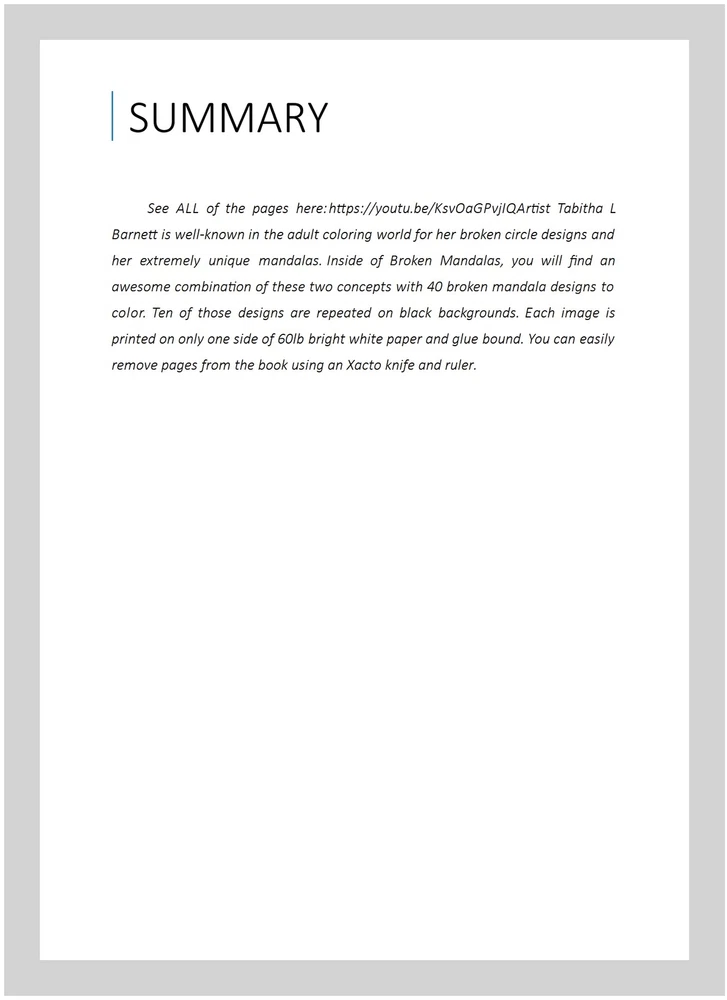 Broken Mandalas: A Unique Adult Mandala Coloring Book by Barnett, Tabitha L., ISBN 1717553095, ISBN-13 9781717553096, Brand New, Free shipping in the US See ALL of the pages here: Tabitha L Barnett is well-known in the adult coloring world for her broken circle designs and her extremely unique mandalas. Inside of Broken Mandalas, you will find an awesome combination of these two concepts with 40 broken mandala designs to color. Ten of those designs are repeated on black backgrounds. Each image is printed on only one side of 60lb bright white paper and glue bound. You can easily remove pages from th using an Xacto knife and ruler.