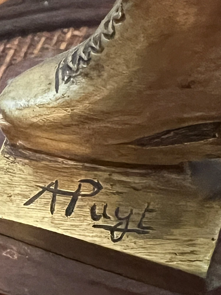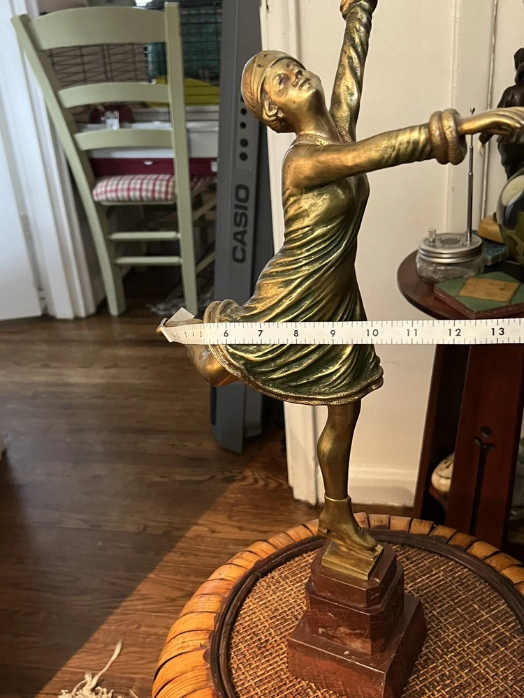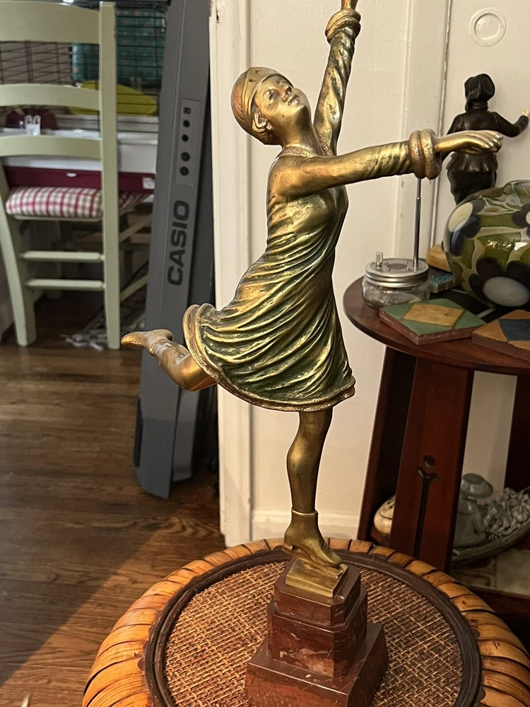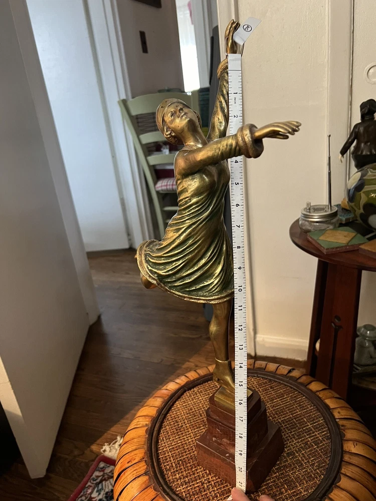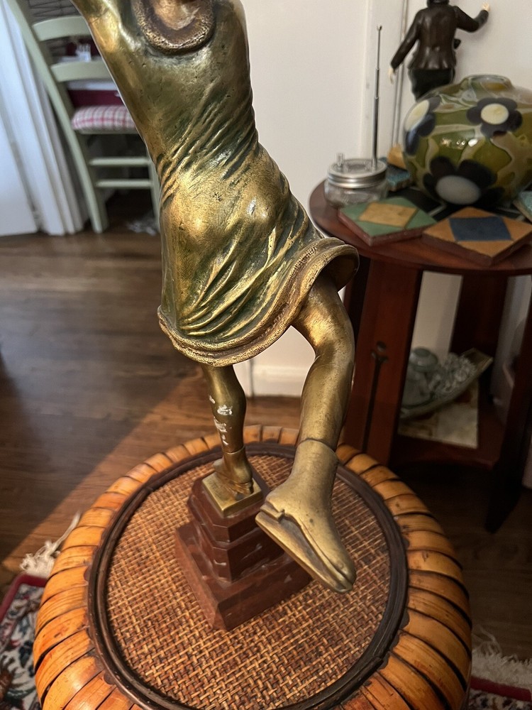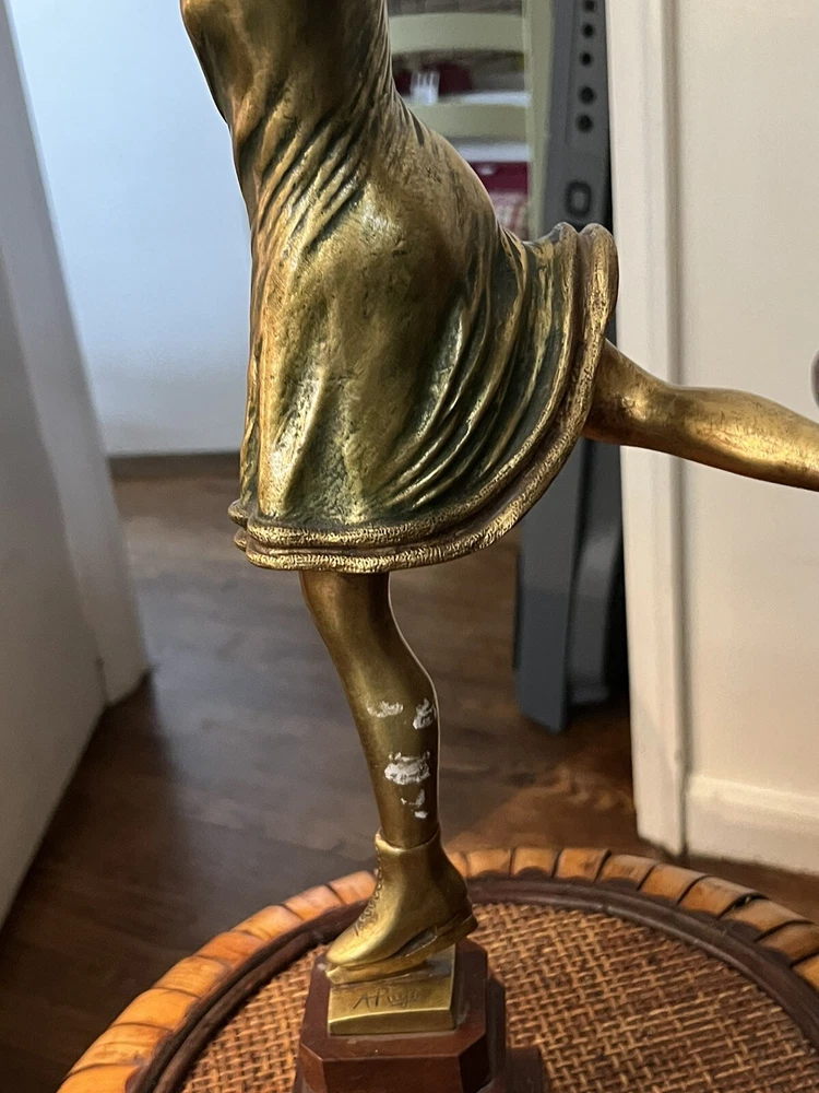 Gracefully capturing the elegance of a skater in mid-pose, this Art Deco ice skater sculpture is a timeless piece that beautifully embodies the chic style of its era. Crafted from high-quality bronze, the sculpture rests atop a polished marble base, enhancing its classical appeal and adding to its overall sophistication.The work is signed, indicating its authenticity and the artist's touch, making it a collectible treasure for enthusiasts and connoisseurs alike. Its striking presence is sure to be a conversation starter, whether placed in a private gallery or as a standout piece in a entryway. It's in wonderful condition, little wear of some of the gold paint on the one calf of a leg, but it could easily be touched up with some gold paint, no breaks, scratches, it's in overall great shape, would be great entryway piece. Artist signed, she is 19" without stand and 23" with marble base.
